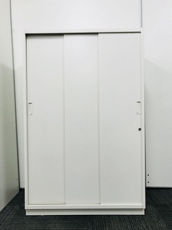 【スライド式なので開閉スペースに困りません!人気の3枚引き戸書庫!】■イトーキ (ITOKI)製 シンラインシリーズ 引き違い書庫 ローキャビネット 3枚引き戸 H1120㎜ ■天板付 ■ホワイト ■シリンダー錠
