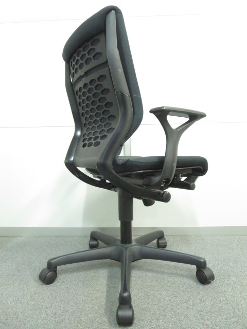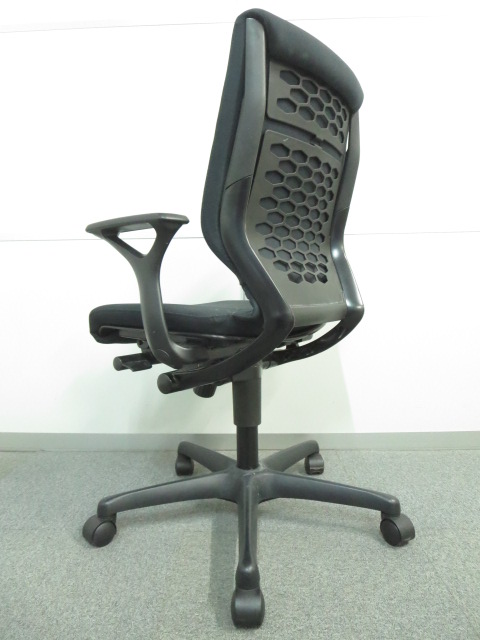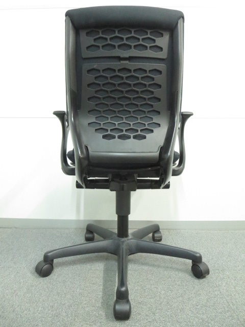 ナビオチェアでは、背当てに新開発の伸縮性のある樹脂製フレキシブルシェル構造(ハニカム構造)を採用。