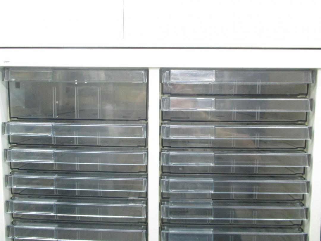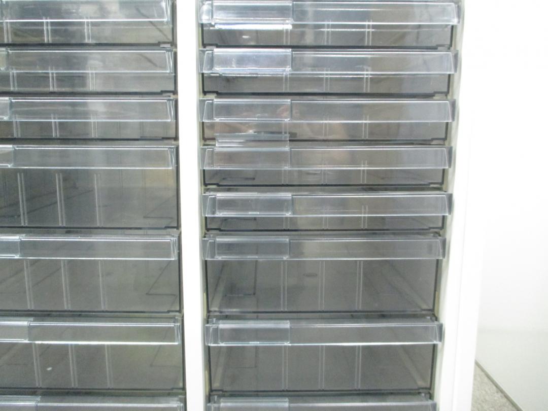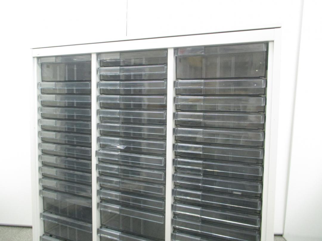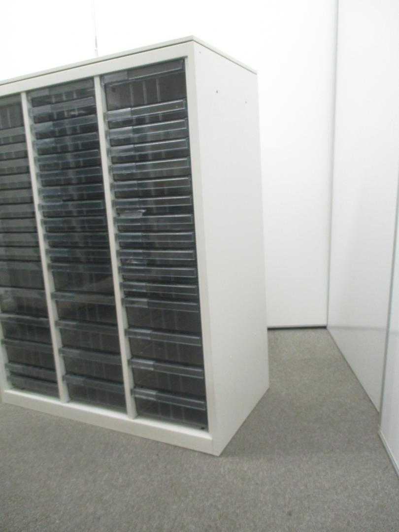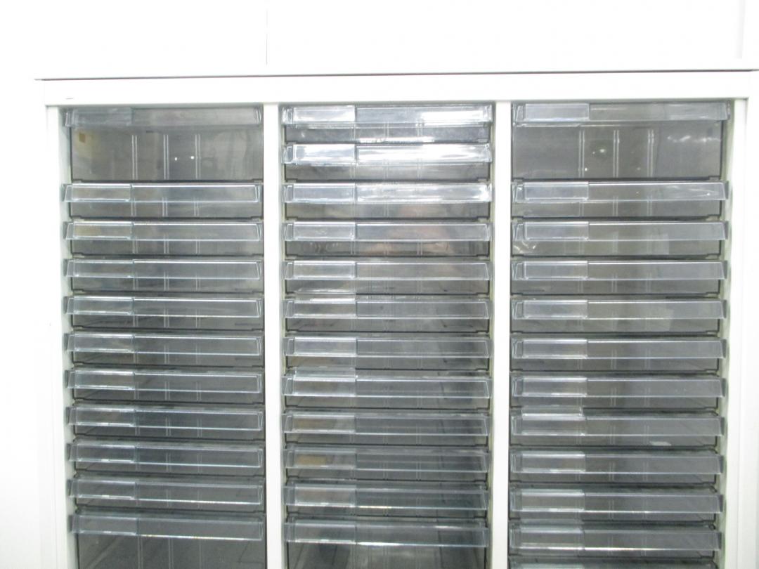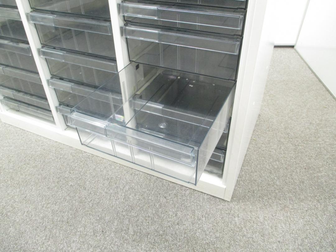【色々な用途に対応するクリスタルトレイ】明るいホワイトカラーのクリスタルトレイ書庫■深型・浅型混在の特殊仕様!【中央区】【日本橋】【中古オフィス家具】- 日本橋店