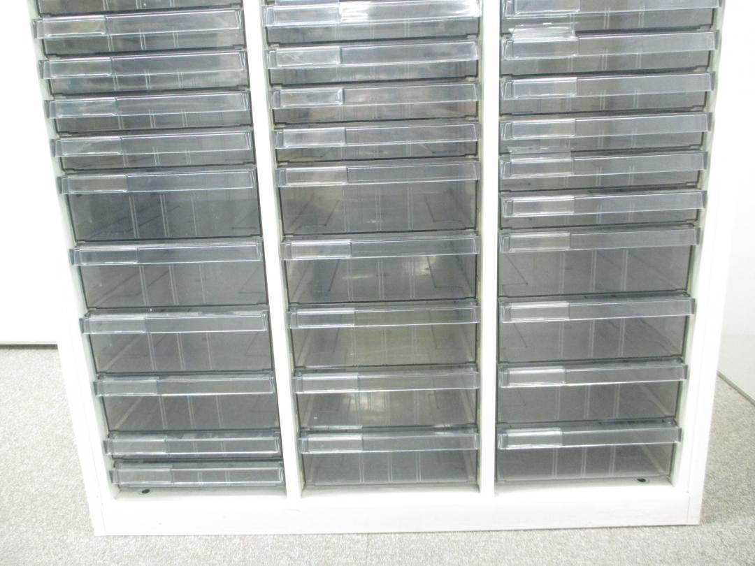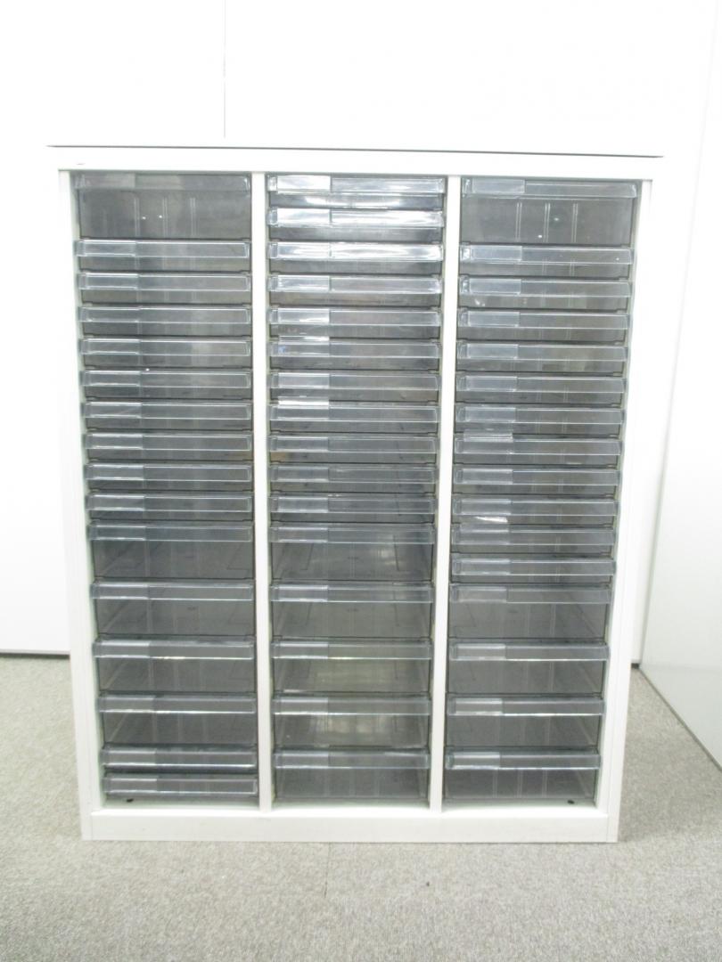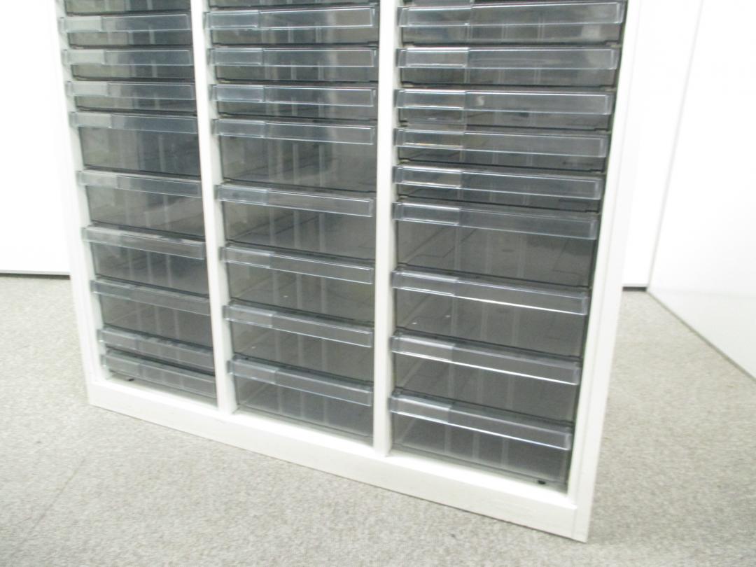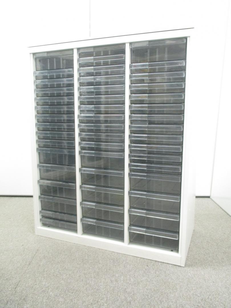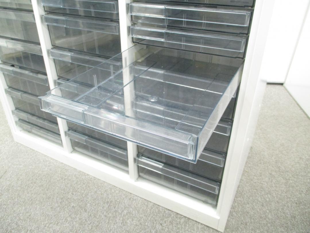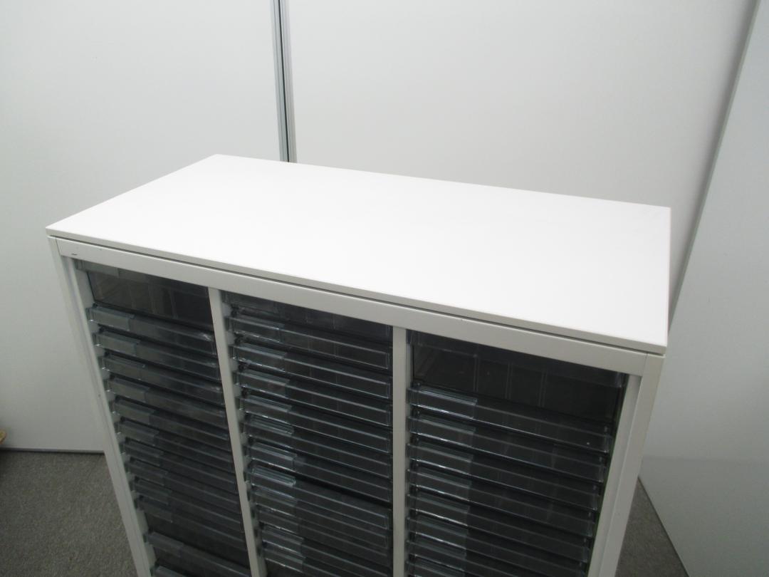 【色々な用途に対応するクリスタルトレイ】明るいホワイトカラーのクリスタルトレイ書庫■深型・浅型混在の特殊仕様!【中央区】【日本橋】【中古オフィス家具】- 日本橋店
