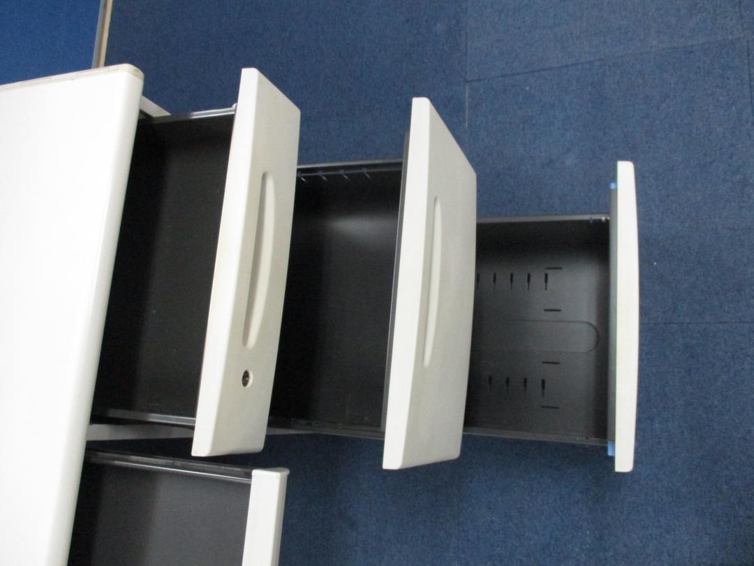 - 袖机のワゴンは、最下段がロング引出しになっており、従来より収納力120%アップ。