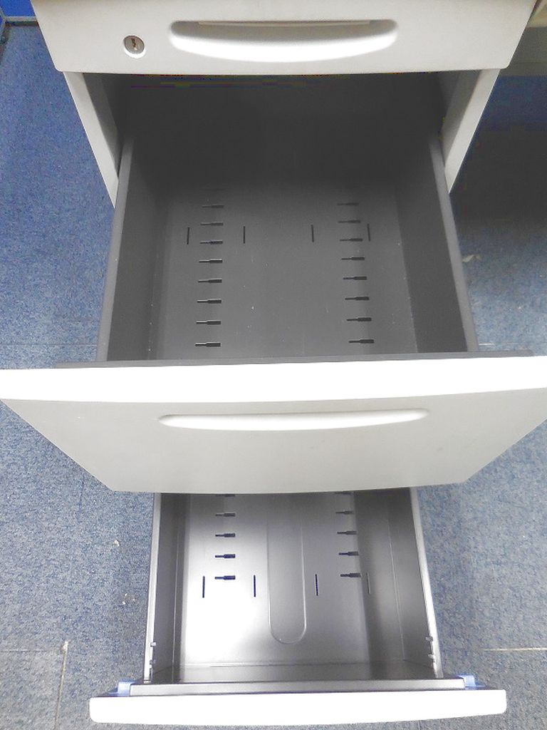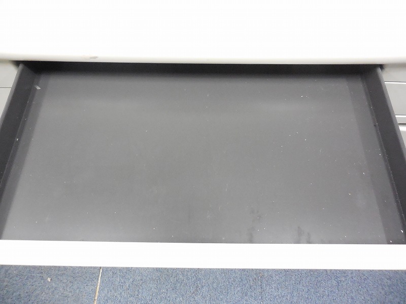 - 袖机のワゴンは、最下段がロング引出しになっており、従来より収納力120%アップ。