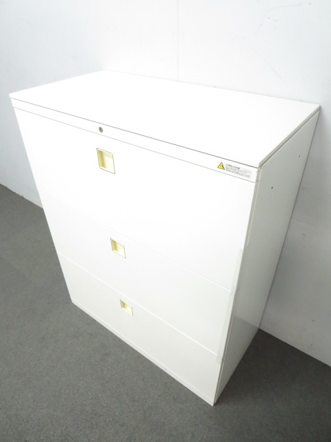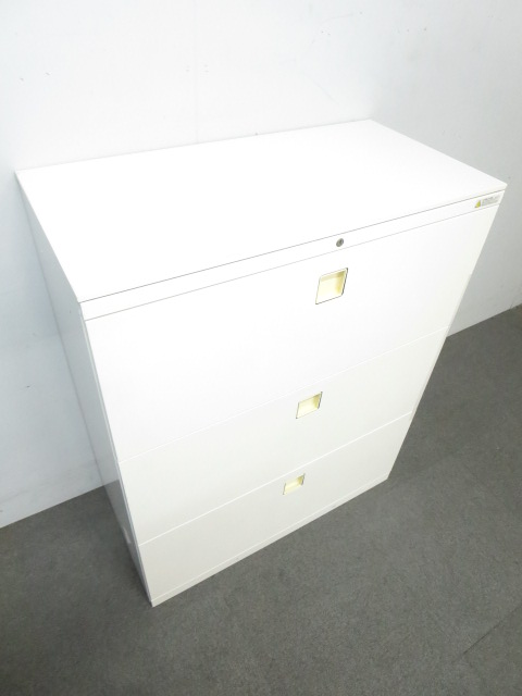 オカムラ レクトライン 3段ラテラル書庫 ホワイト天板 シリンダー錠 鍵付き ※取っ手部分に若干日焼けあり
