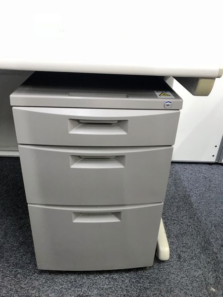 - 袖机のワゴンは、最下段がロング引出しになっており、従来より収納力120%アップ。