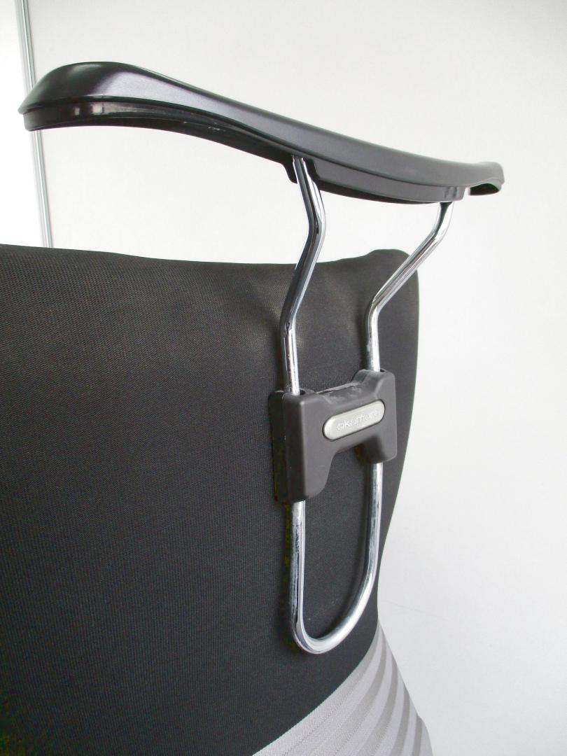 - 背もたれの裏側にハンガーがついているので上着などを形よく掛けられ、袖や裾が床に付きにくくなります。