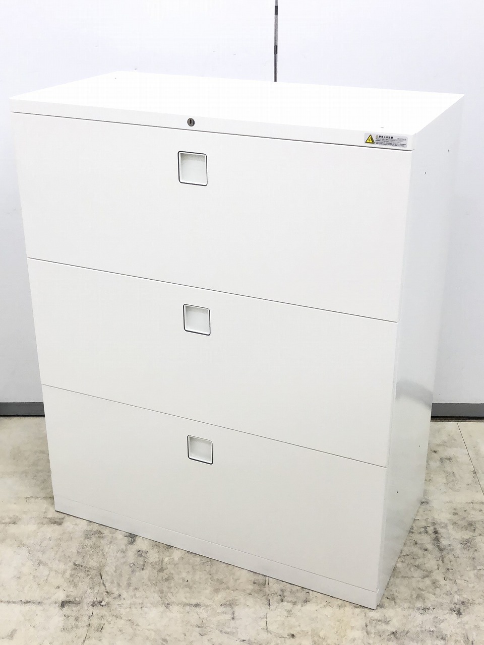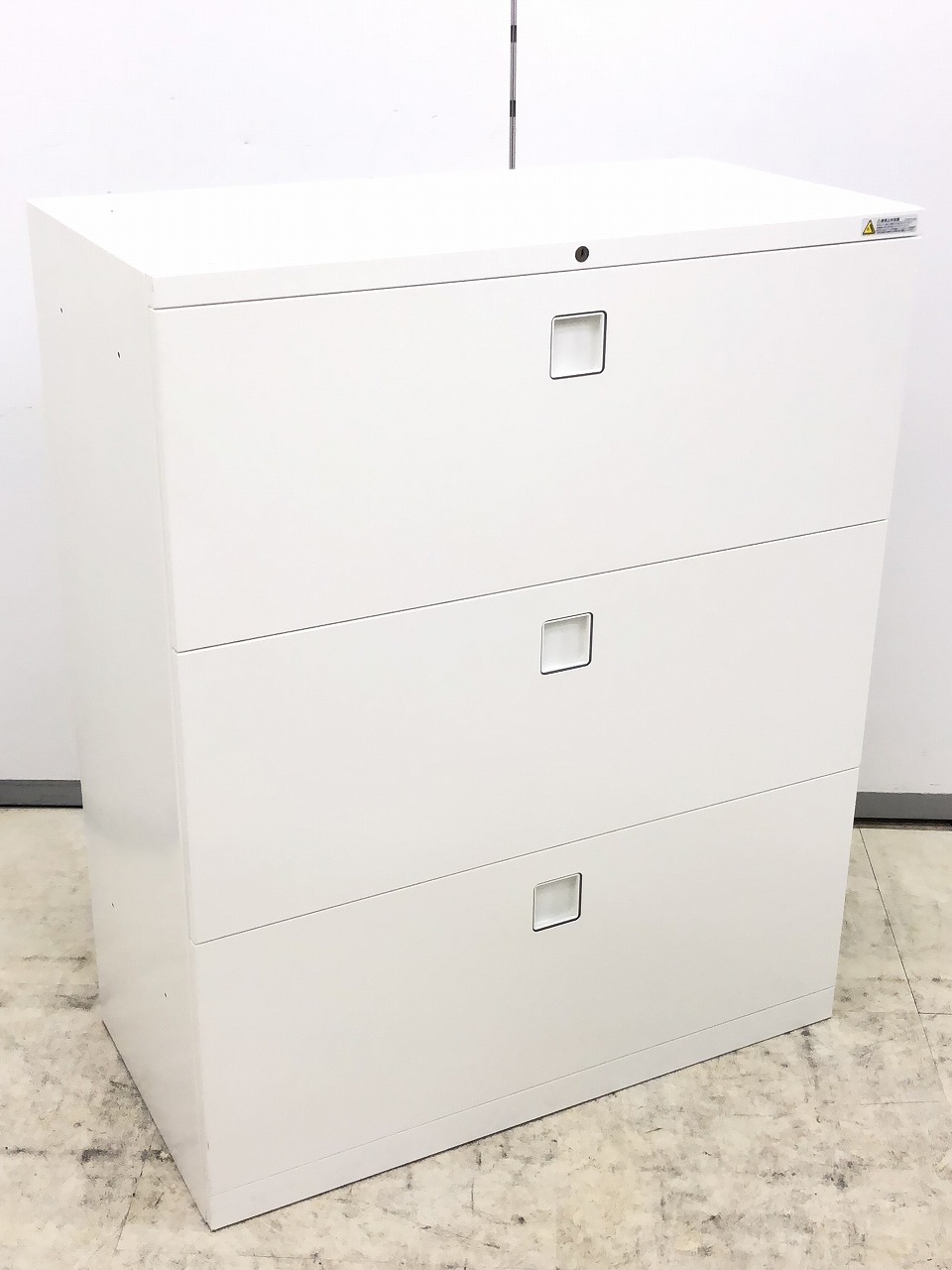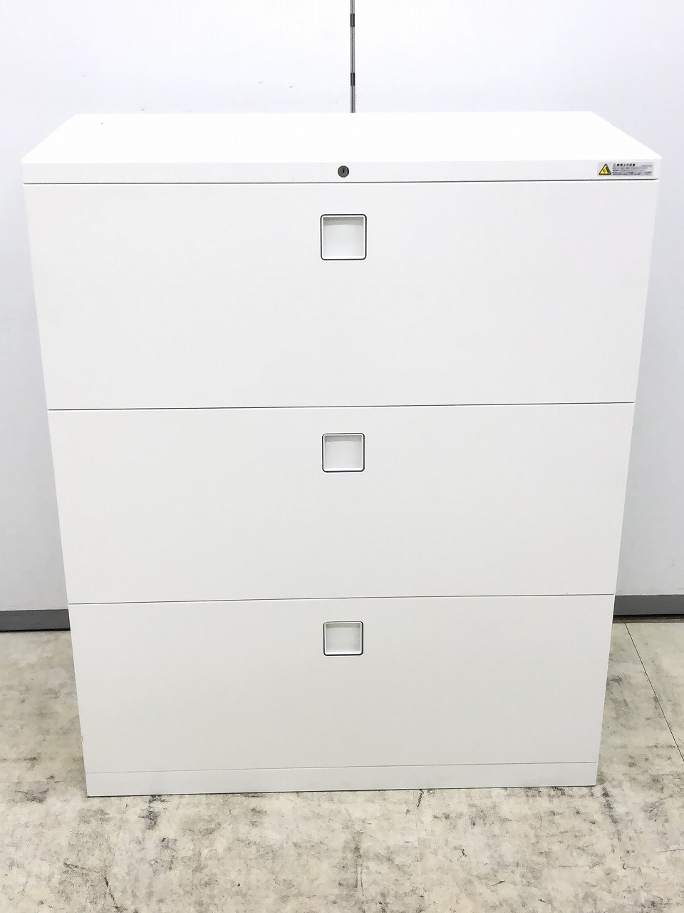 ■オカムラ(okamura)製 レクトラインシリーズ 3段ラテラル ローキャビネット ■天板・ベース付 ■シリンダー錠 ■ホワイト ■収納力抜群【弊社使用欄:A01037187】【SN】