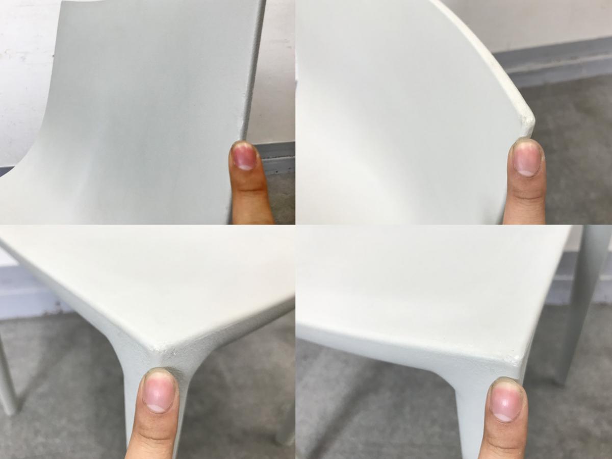 - かなり強い濃い黄ばみ・変色が商品全体にある。(例、座面・背もたれ、脚部等にある。)