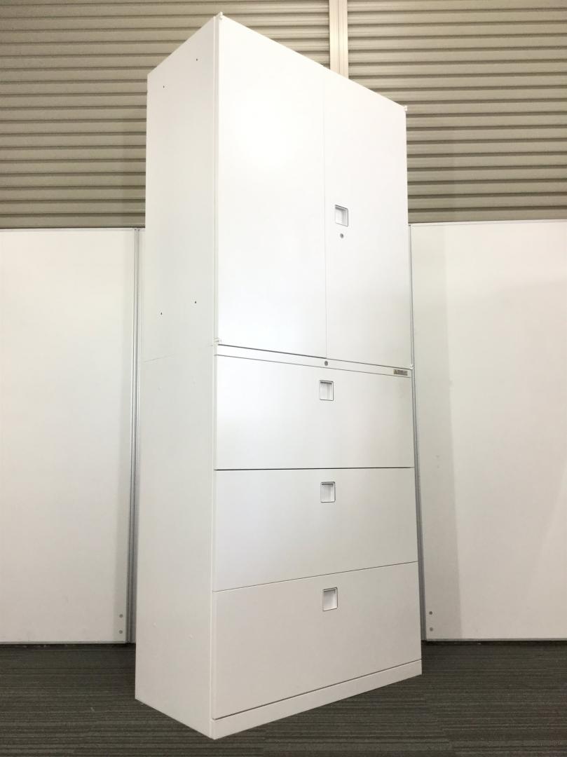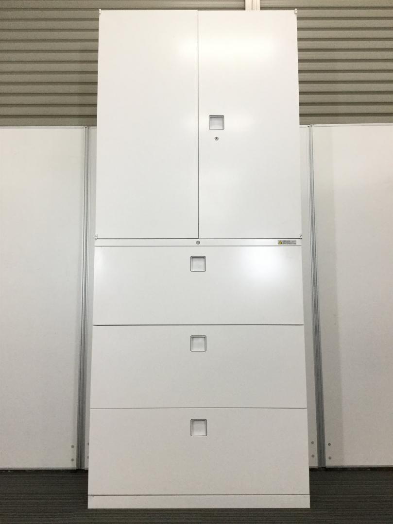 スライド式の扉+引き出しタイプの便利な書庫セットが入荷!使い勝手抜群のハイキャビネットが入荷! ■オカムラ/レクトライン/ホワイト 2枚引き戸+3段ラテラルキャビネット
