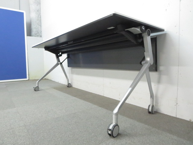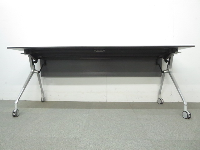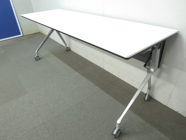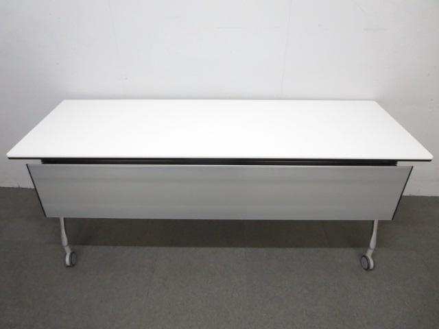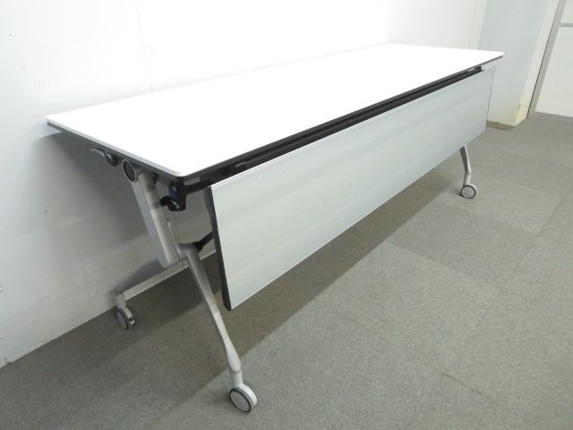 【シャープなフォルムとやさしいラインが印象的!】■オカムラ サイドフォールドテーブル ■W1800×D600mm ホワイト 幕板パネル付き【平行ネスティング】- 川崎店