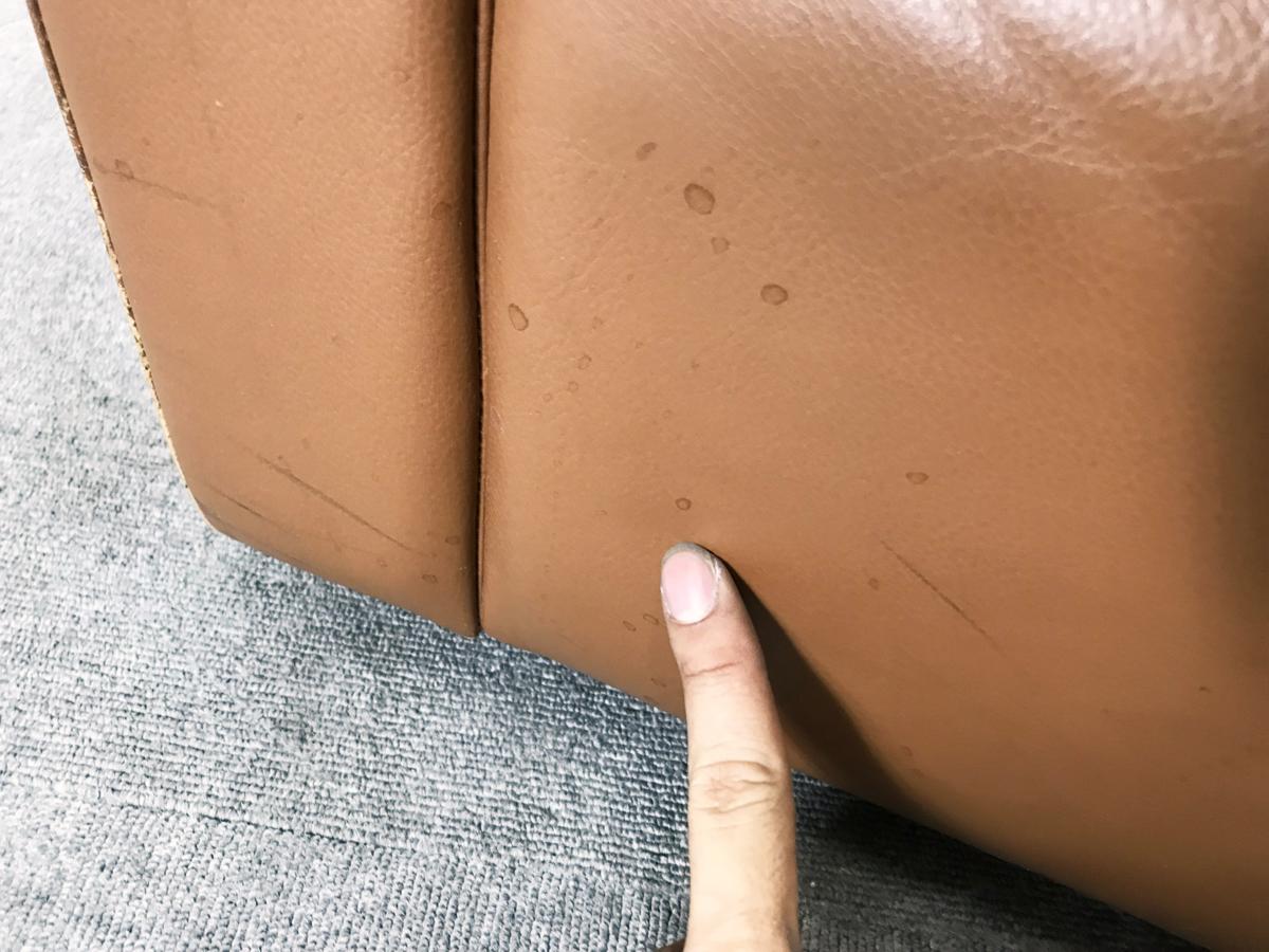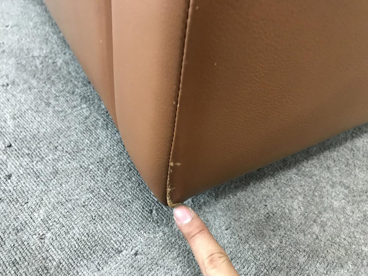 - あり黄ばみ・変色が広い範囲にうっすらある、または濃い黄ばみ・変色が一部ある。(例:三人用ソファ、二人用ソファ、一人用ソファの場合、背もたれ、肘かけ、座面等、 センターテーブルの場合、天板、脚にある。)