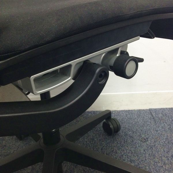- レバーを引き上げながら座面を前後にスライドさせ、レバーを放すとロックします。背もたれに身体をつけた状態で膝の裏側と座面のエッジの間に5-8センチほどの隙間ができるのが理想的です。