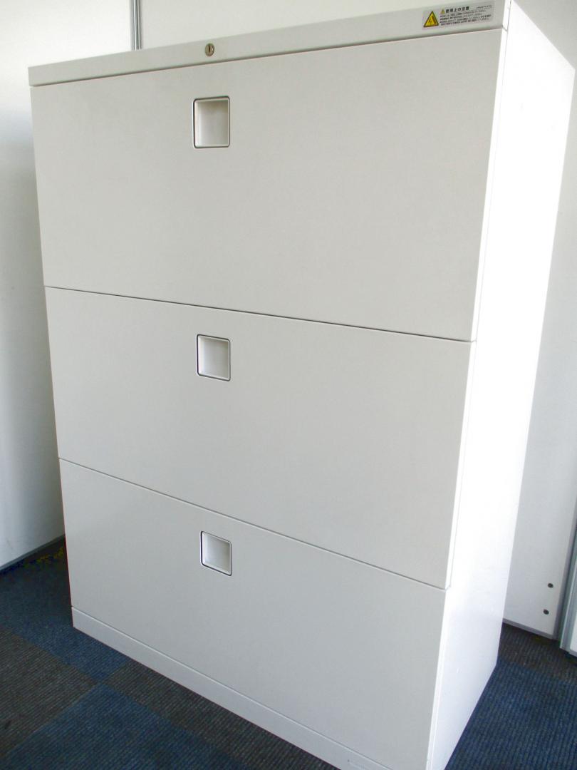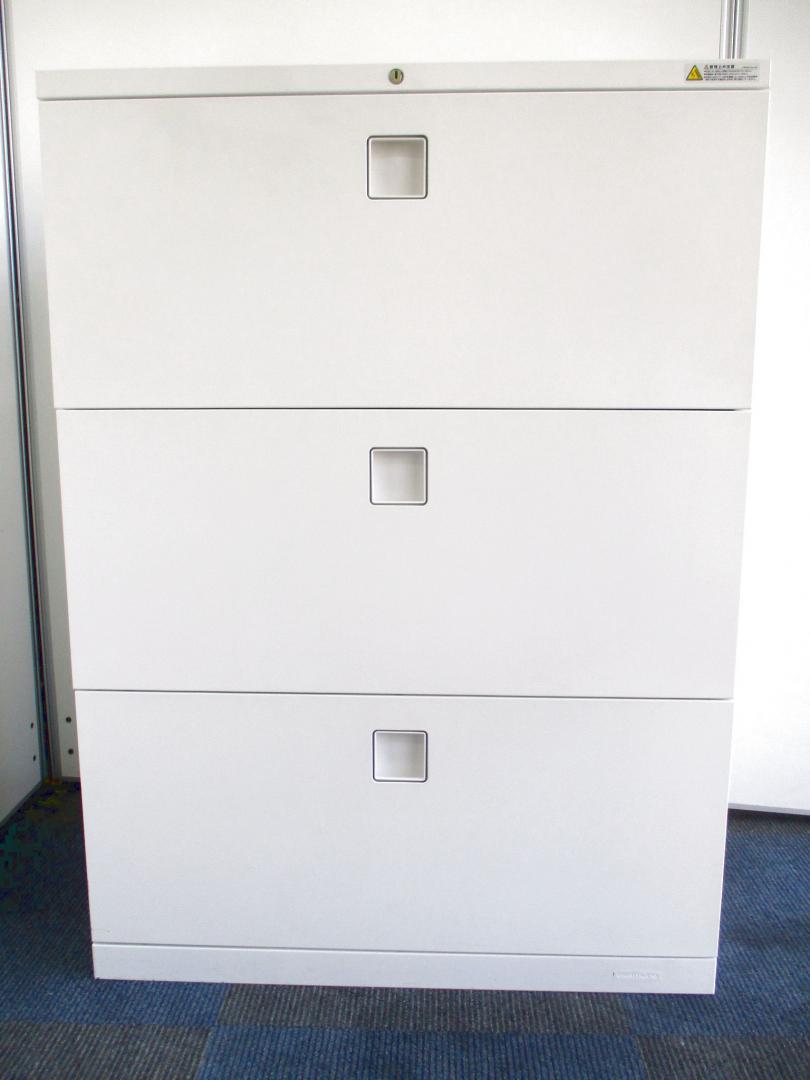 オカムラ レクトライン 3段ラテラル書庫 ホワイト天板 シリンダー錠 鍵付き ※取っ手部分に若干日焼けあり