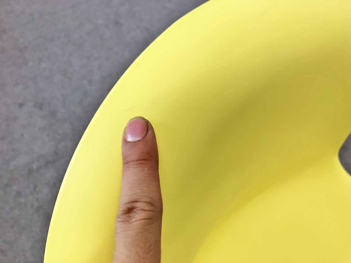 - かなり強い濃い黄ばみ・変色が商品全体にある。(例、座面・背もたれ、脚部等にある。)