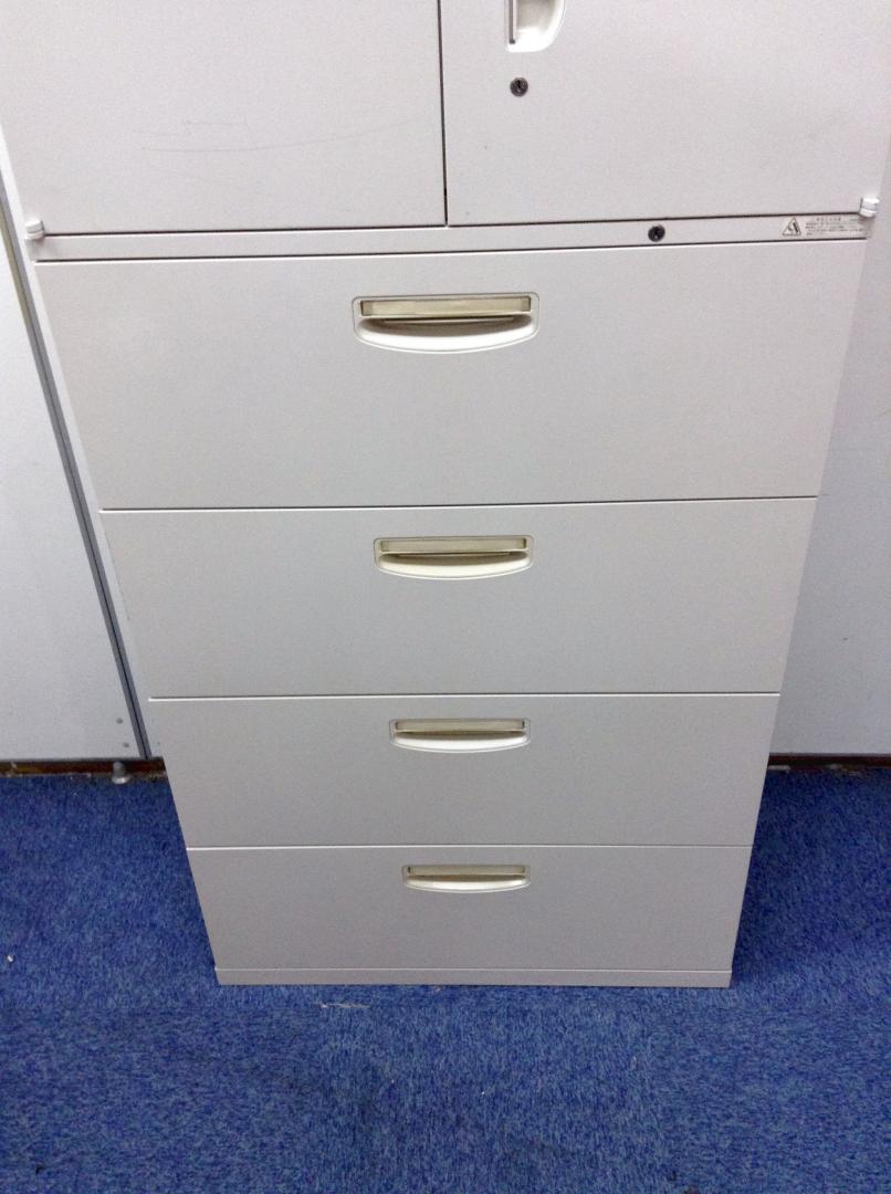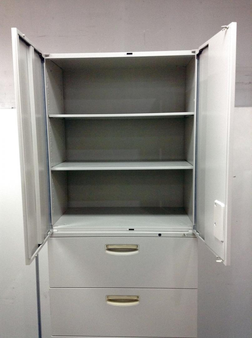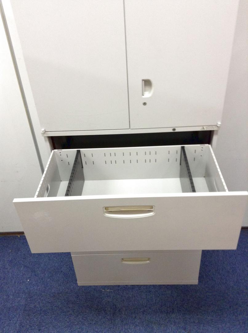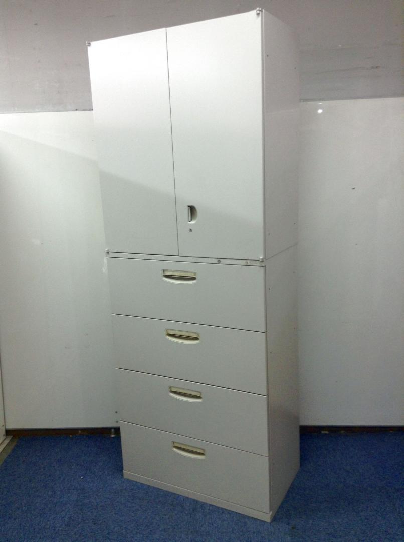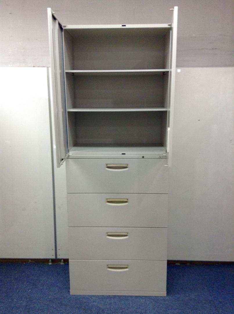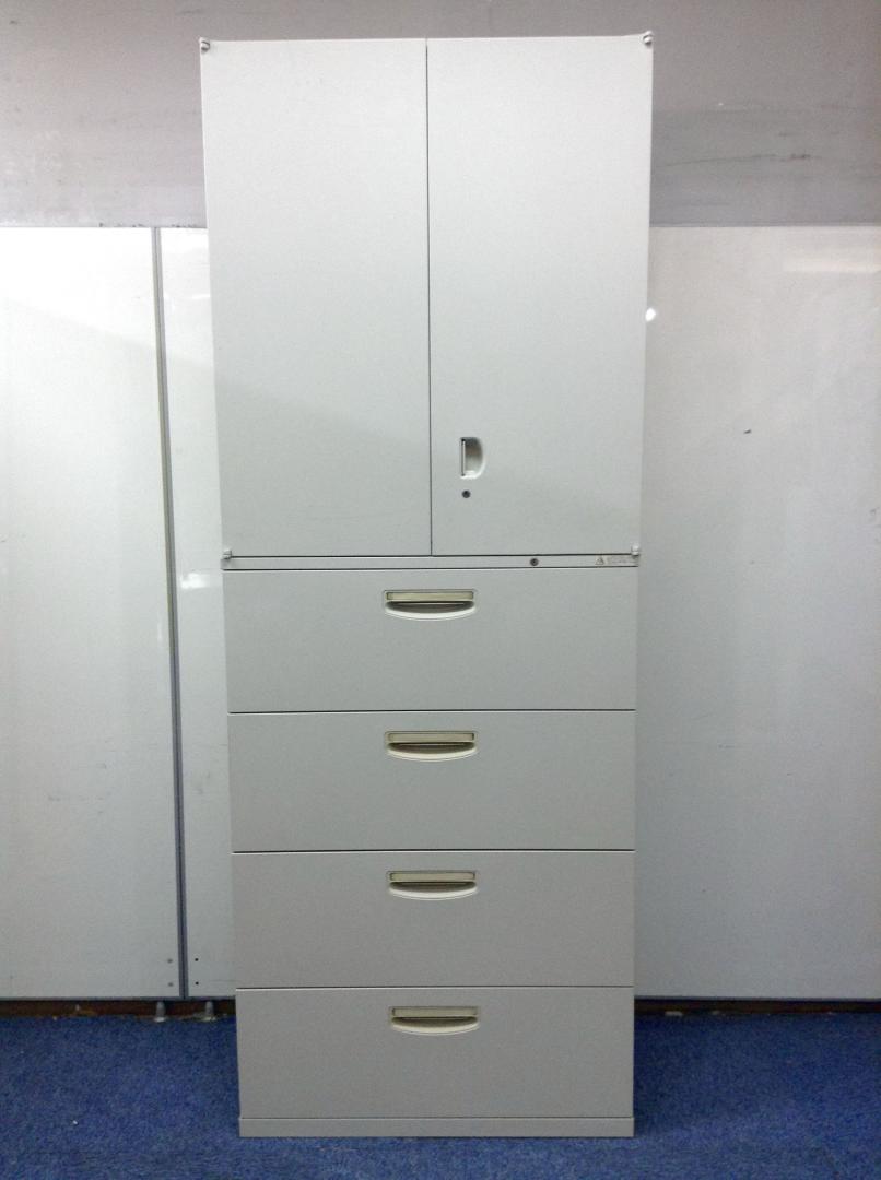 オカムラ製の両開き書庫と4段引き出しの上下セットとなります。