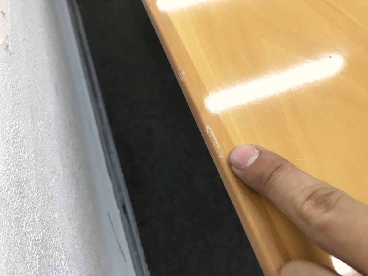 - あり黄ばみ・変色が広い範囲にうっすらある、または濃い黄ばみ・変色が一部ある。(例、天板、幕板、棚板、サイド部分、脚部等にある。)