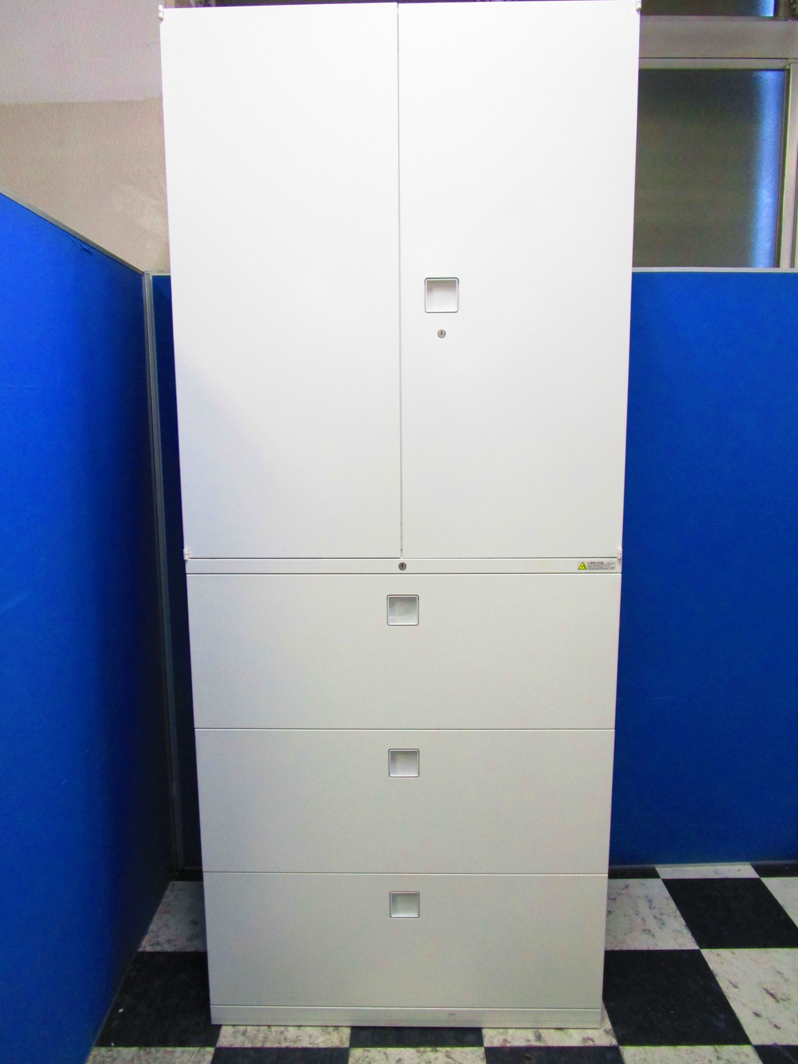 スライド式の扉+引き出しタイプの便利な書庫セットが入荷!使い勝手抜群のハイキャビネットが入荷! ■オカムラ/レクトライン/ホワイト 2枚引き戸+3段ラテラルキャビネット