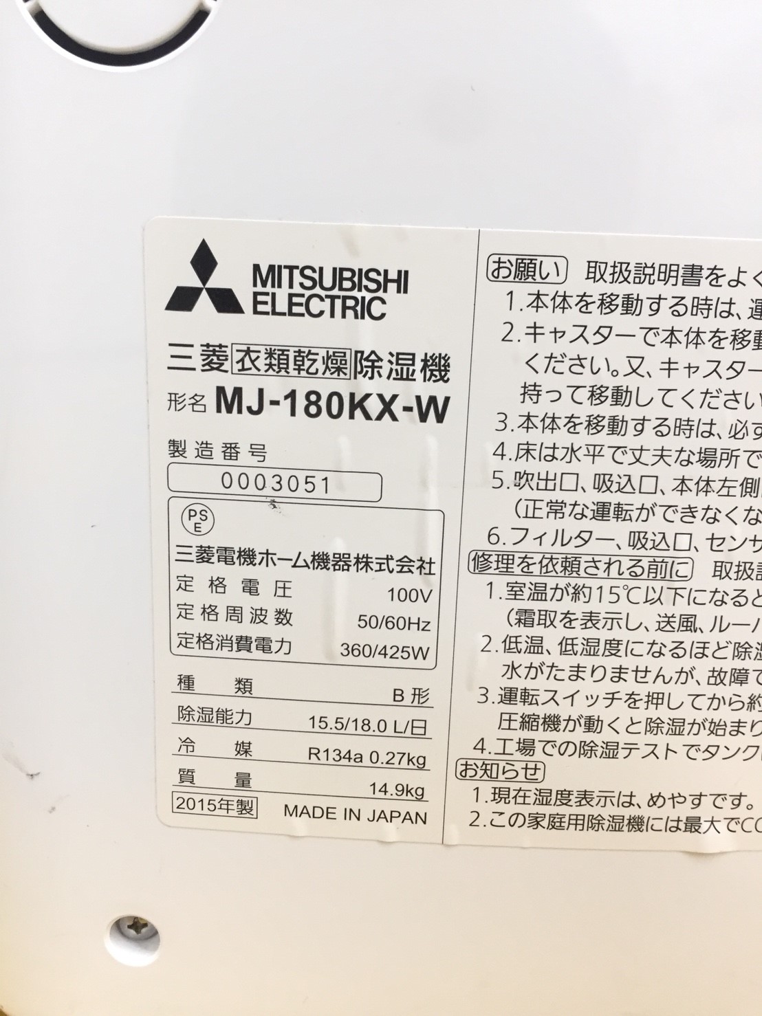 三菱製の除湿器になります!