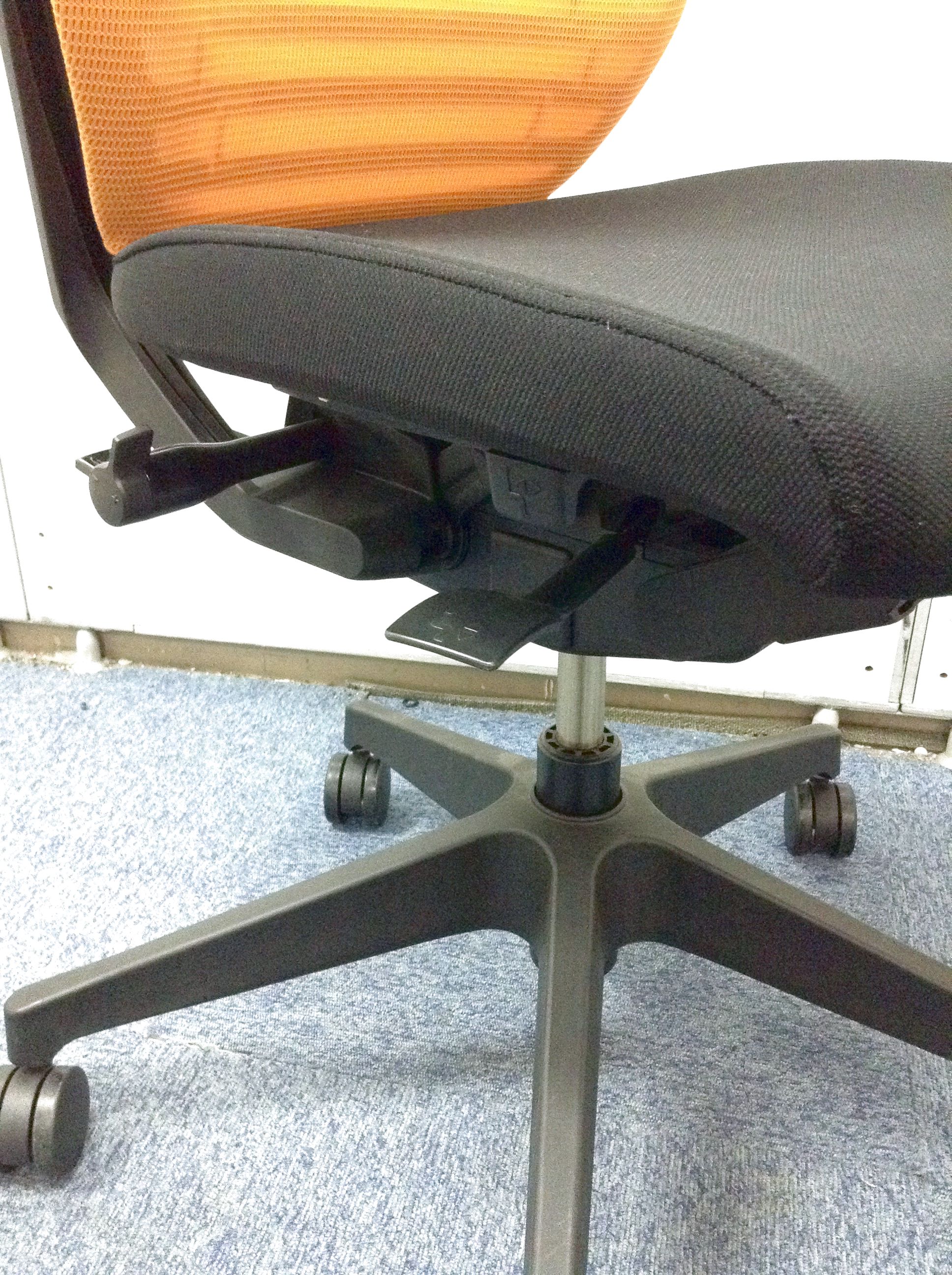 - 座面下のレバー操作により、座面を50mmのストローク(16.7mmピッチ)で好みの位置に調節できます。体格や作業姿勢に合わせたポジション設定が行えます。