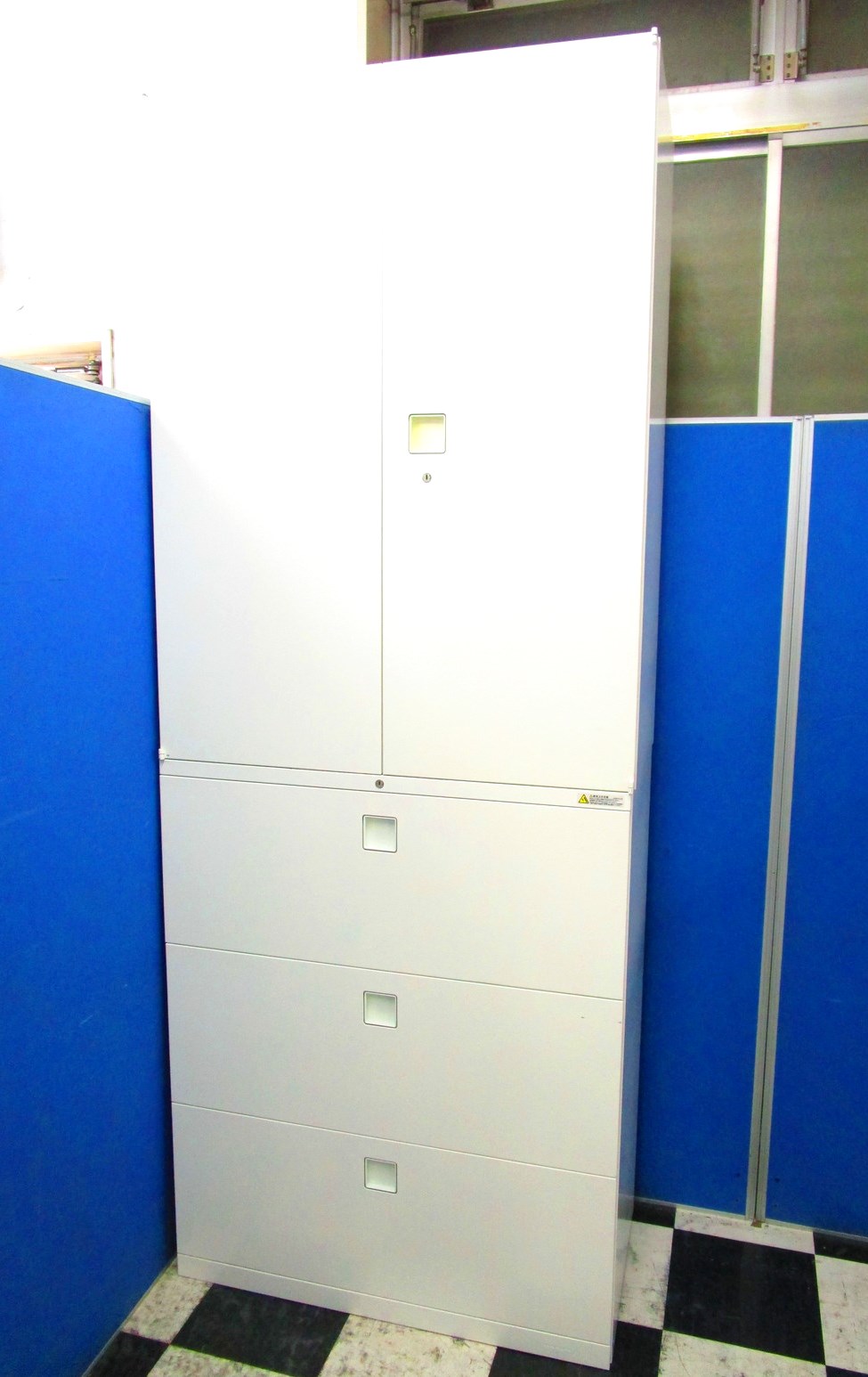 スライド式の扉+引き出しタイプの便利な書庫セットが入荷!使い勝手抜群のハイキャビネットが入荷! ■オカムラ/レクトライン/ホワイト 2枚引き戸+3段ラテラルキャビネット