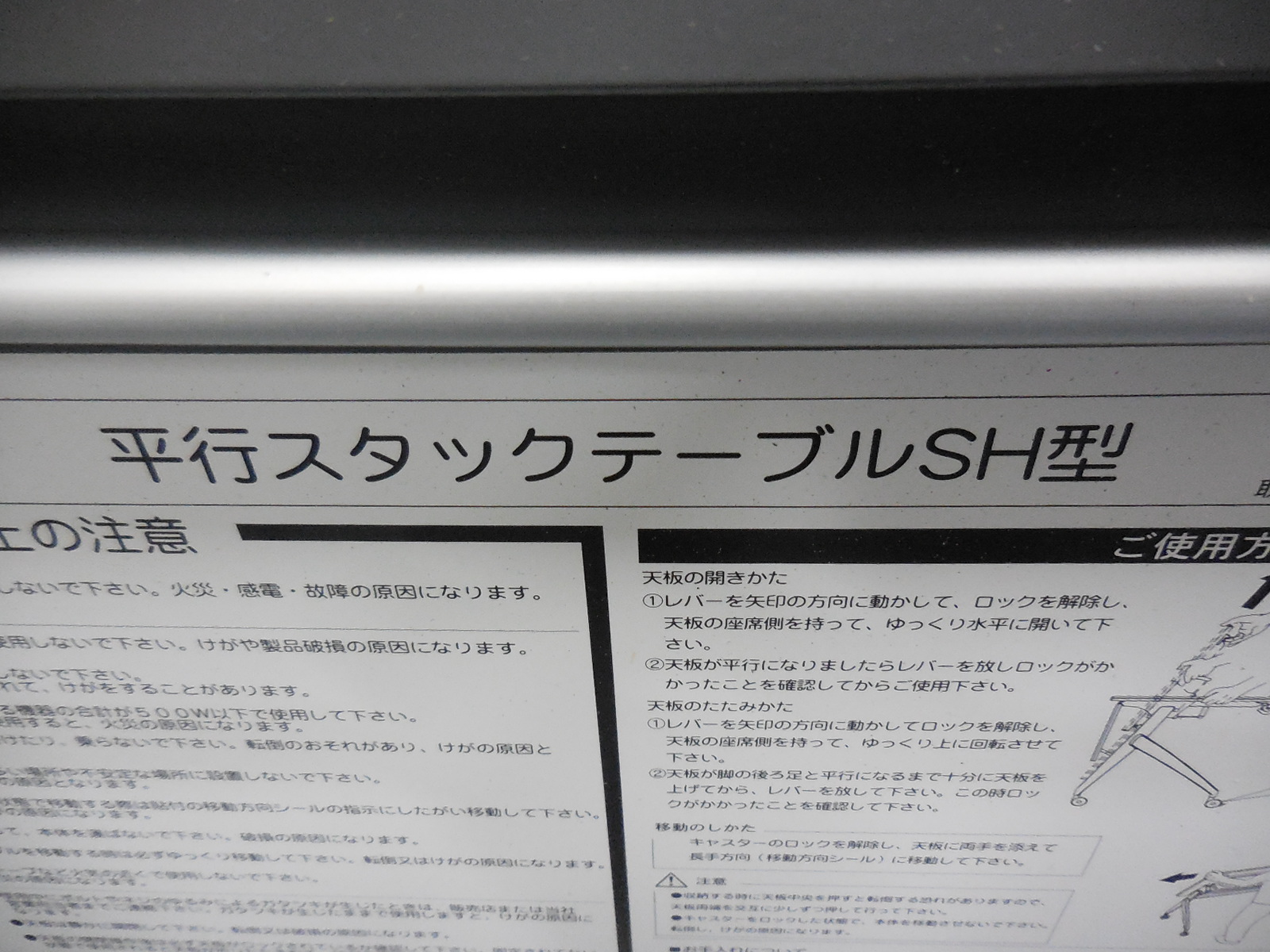 - 一部不具合あり天板歪み、アジャスター無し、キャスター使用不可ようなそのテーブルの本来の効用を果たすための機能以外の一部が使用不可な状態。(例、キャスターロッ ク機能使用不可、棚板無し等がある。)