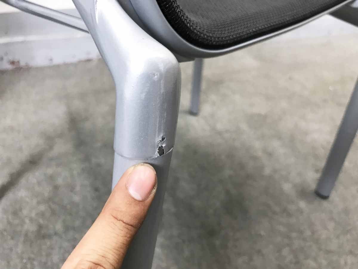 - 目立つ箇所あり傷・破れ・ほつれ・へたり・しわが多数または深い傷・破れ・ほつれ・へたり・しわが一部ある。※座面・背もたれ、シェル、脚部等にある。