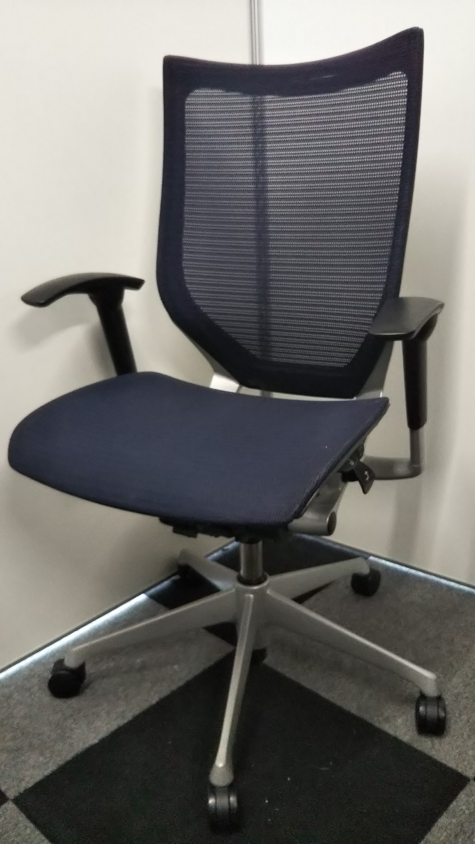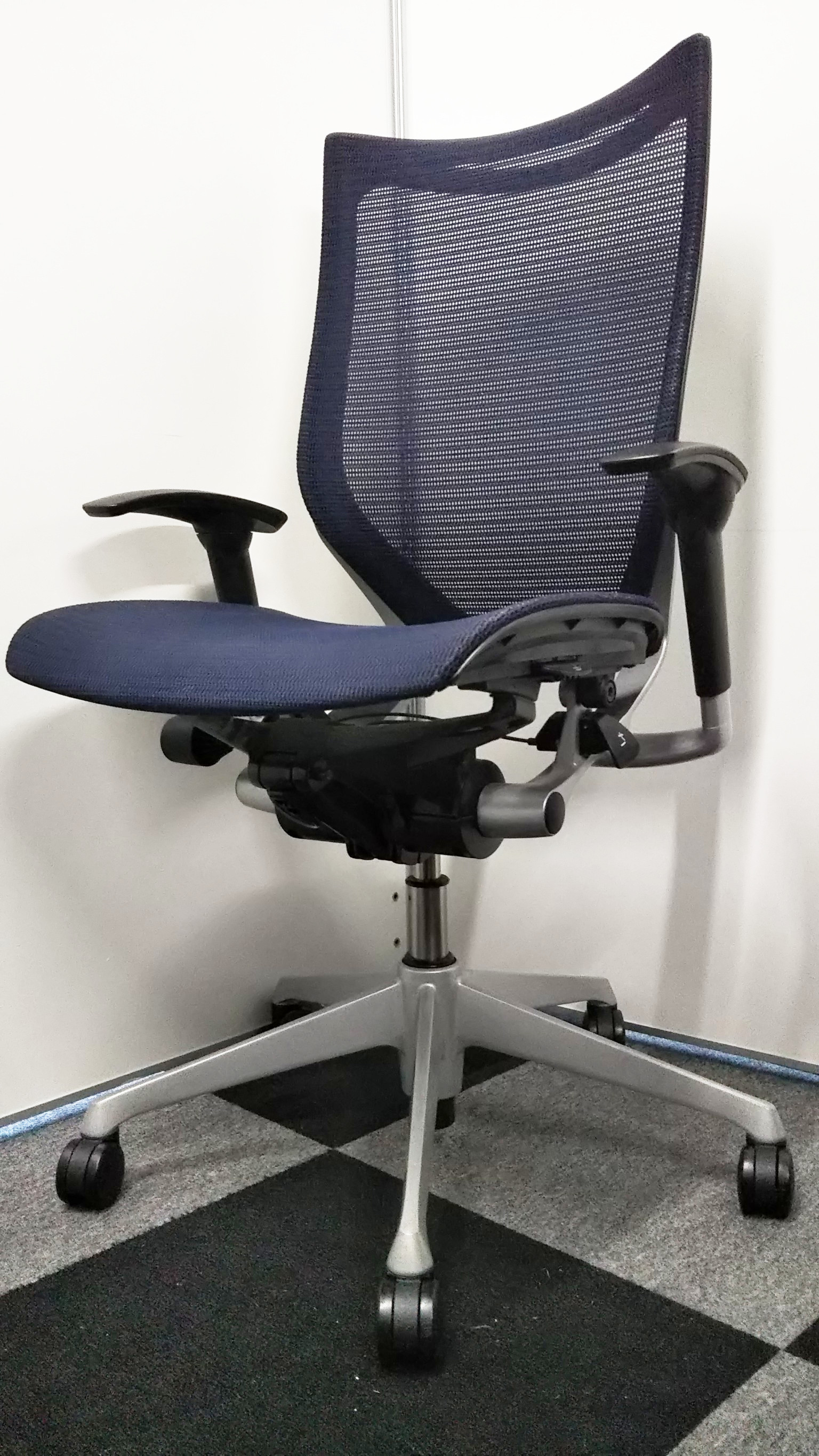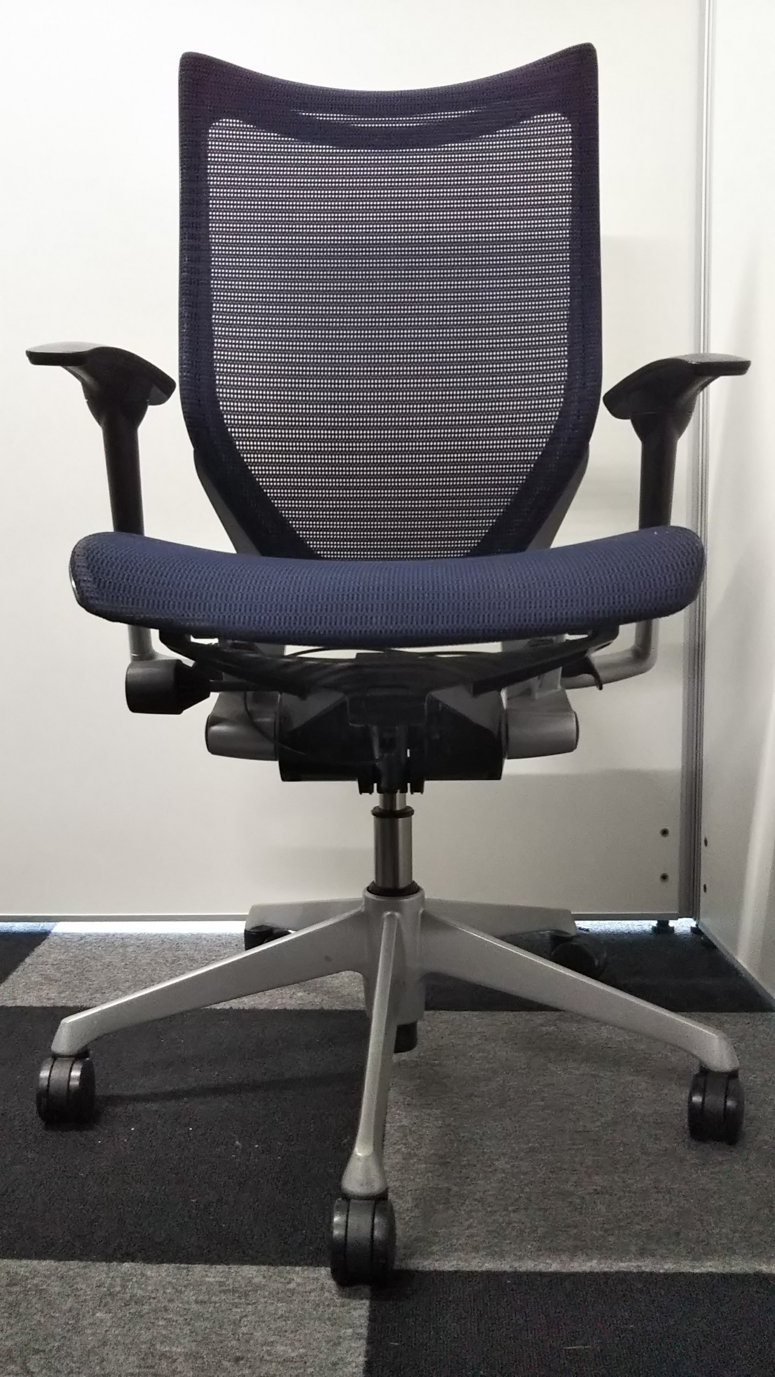 【オフィスの執務室、会議室におすすめ!】■オカムラ(okamura)製 バロン(Baron)チェア 肘付き ハイバック 背面メッシュ ■可動肘 ■ダークブルー × ホワイトシェル【硬めの座面が大人気!国産メッシュチェアの代表格!】【状態良好品!】