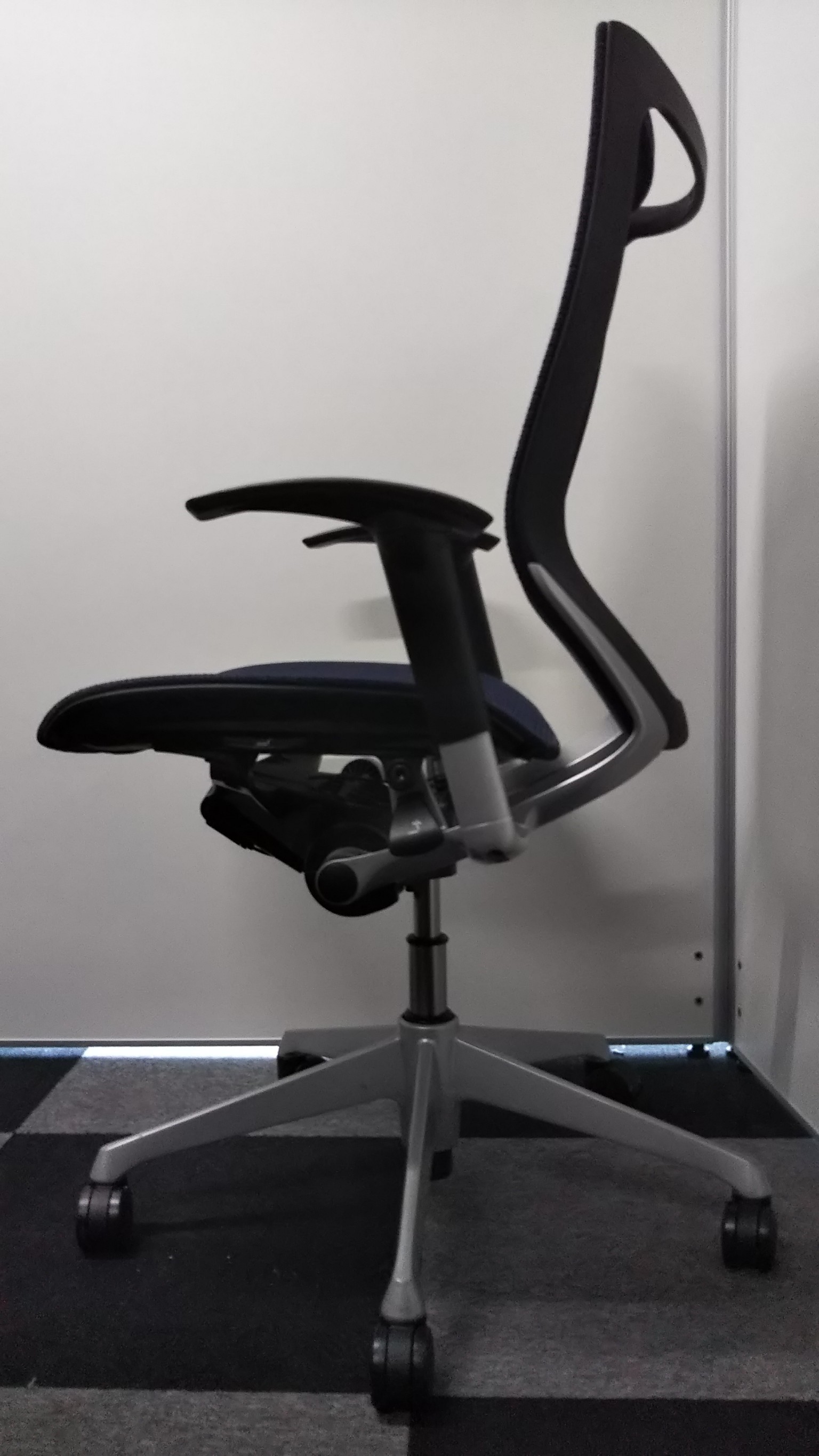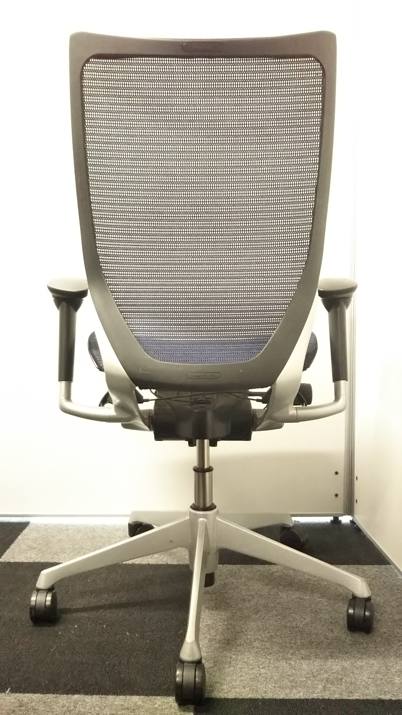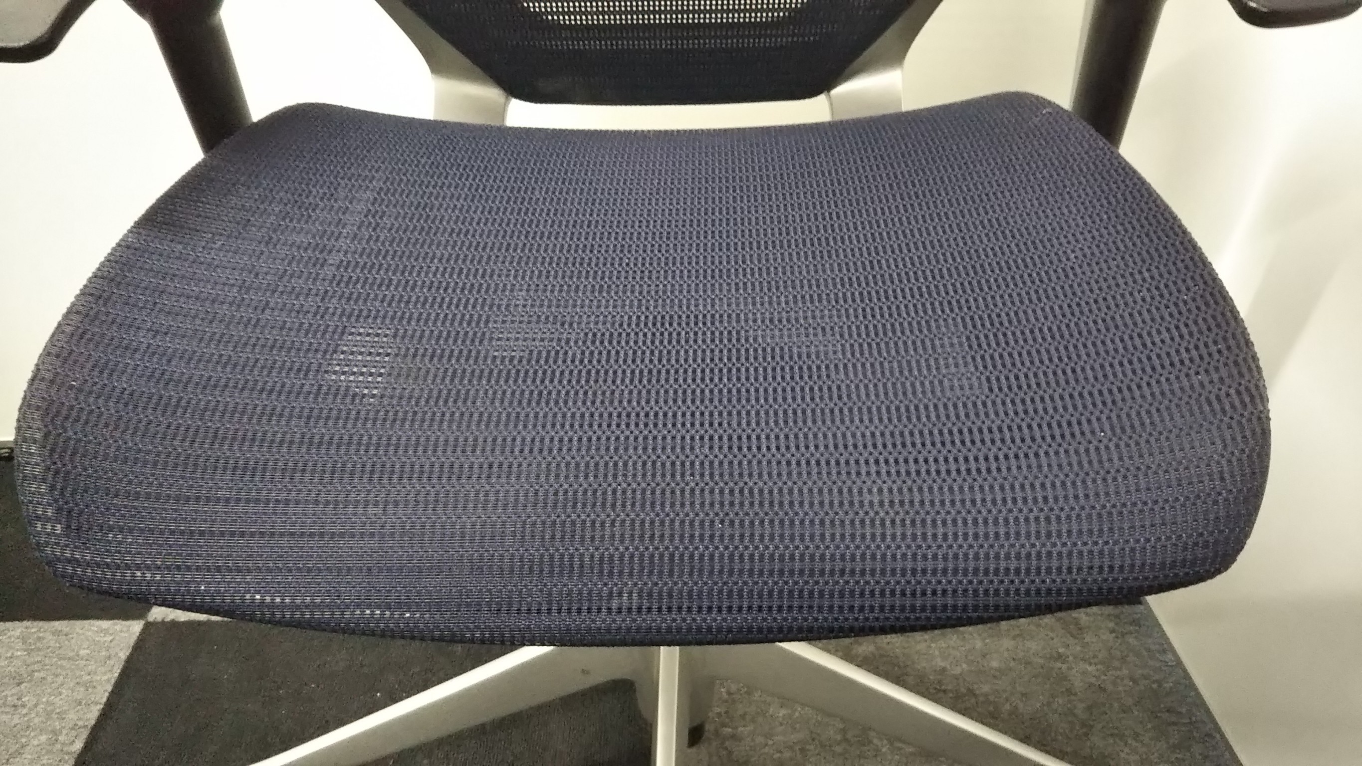 【オフィスの執務室、会議室におすすめ!】■オカムラ(okamura)製 バロン(Baron)チェア 肘付き ハイバック 背面メッシュ ■可動肘 ■ダークブルー × ホワイトシェル【硬めの座面が大人気!国産メッシュチェアの代表格!】【状態良好品!】