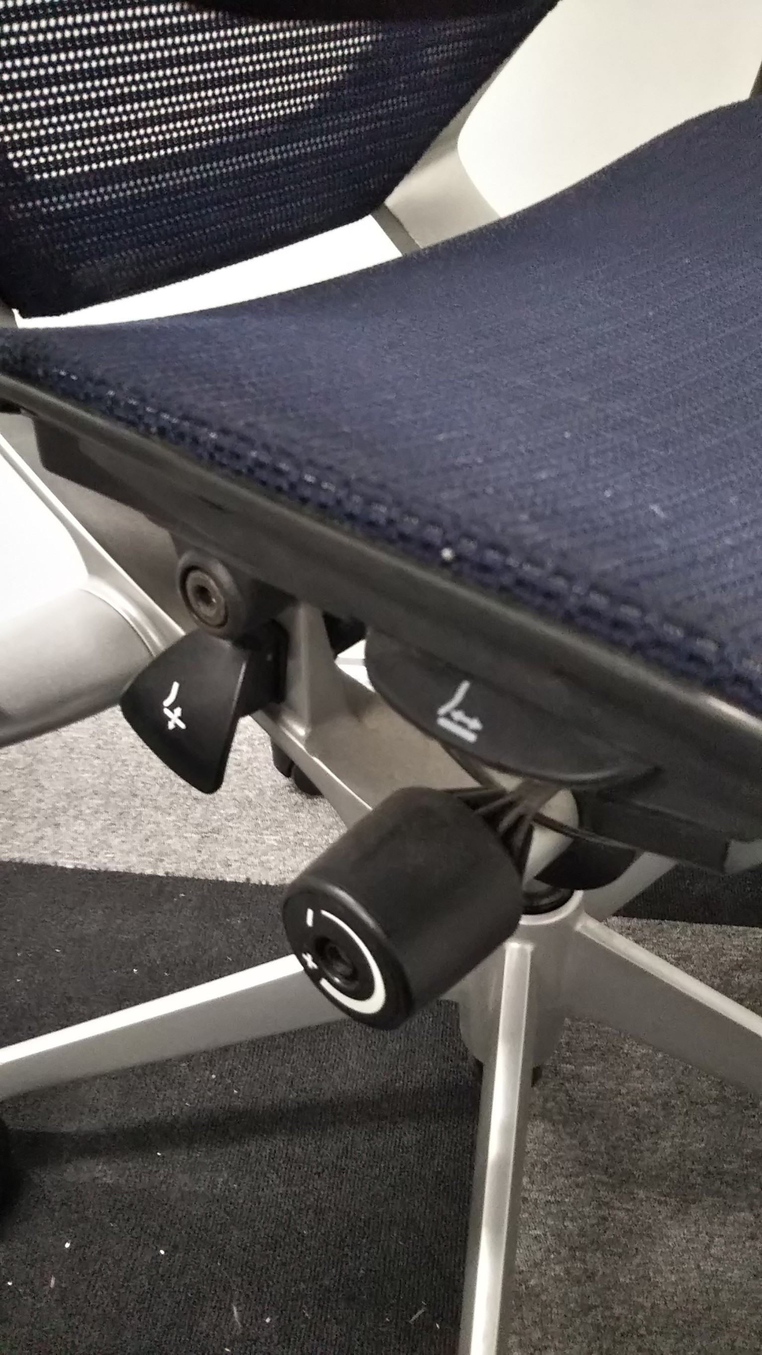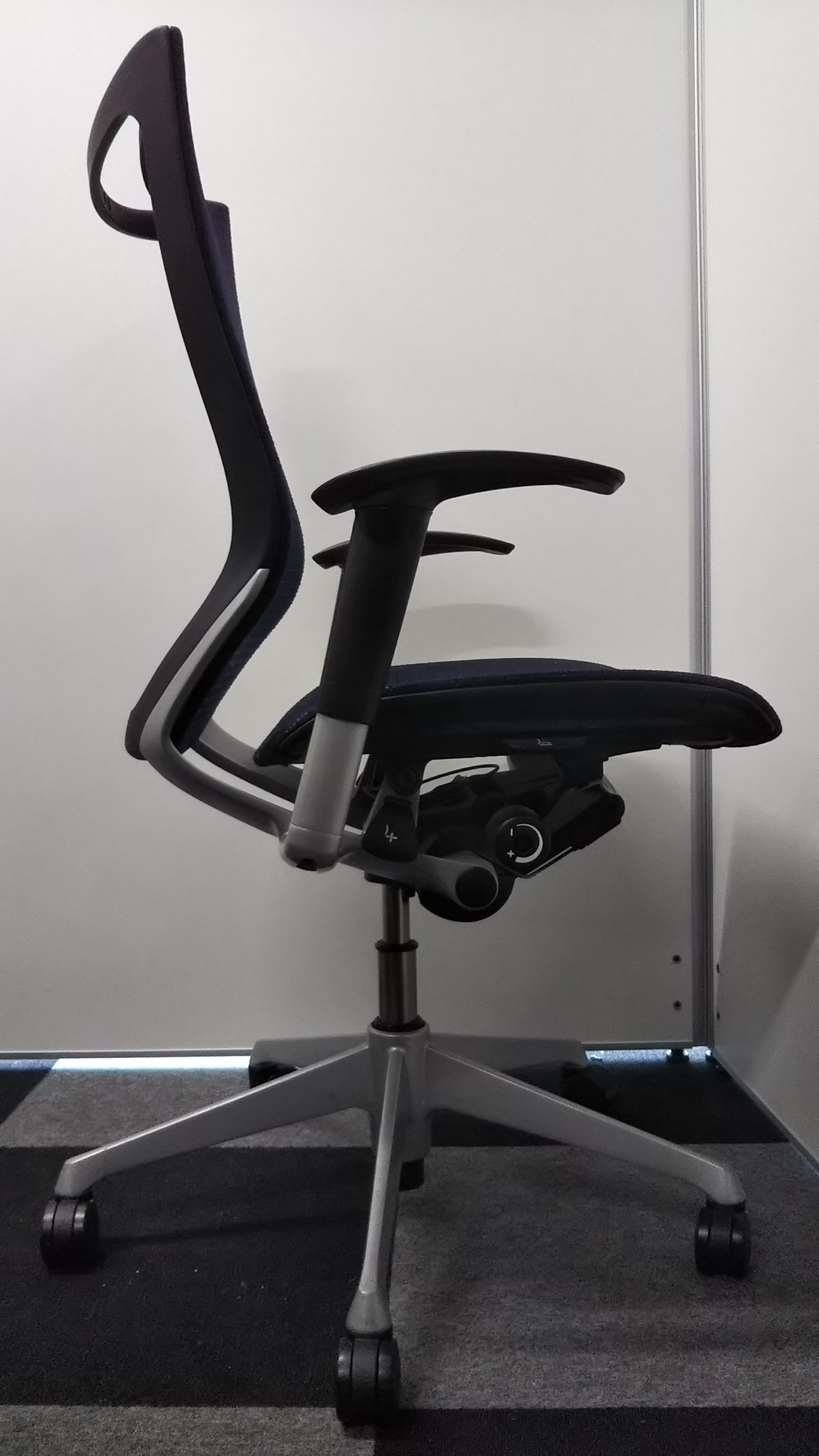 気に入っているのはリクライニング調整の自由さです。同じオカムラ社製の上位モデルや下位モデルも、角度が5段階程度の固定位置だったり、リクライニング強度も4段階だったりしますが、バロンチェアはどちらも無段階。つまり完全に好きな位置、好きな強度に調整することができます。