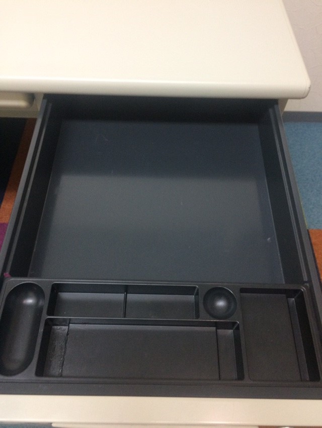 チェアはデスクの上や中に入れて保管しております。もちろん試座も可能ですので、お気軽にお申し付けください!