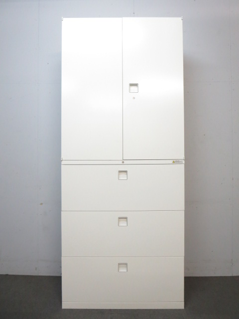 スライド式の扉+引き出しタイプの便利な書庫セットが入荷!使い勝手抜群のハイキャビネットが入荷! ■オカムラ/レクトライン/ホワイト 2枚引き戸+3段ラテラルキャビネット