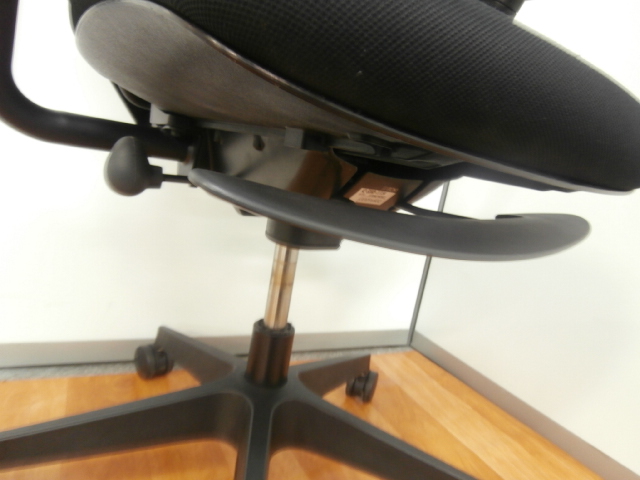 座の上下調節レバーは座面下前方に大きく配置されています。右手、左手のどちらでも操作ができます。