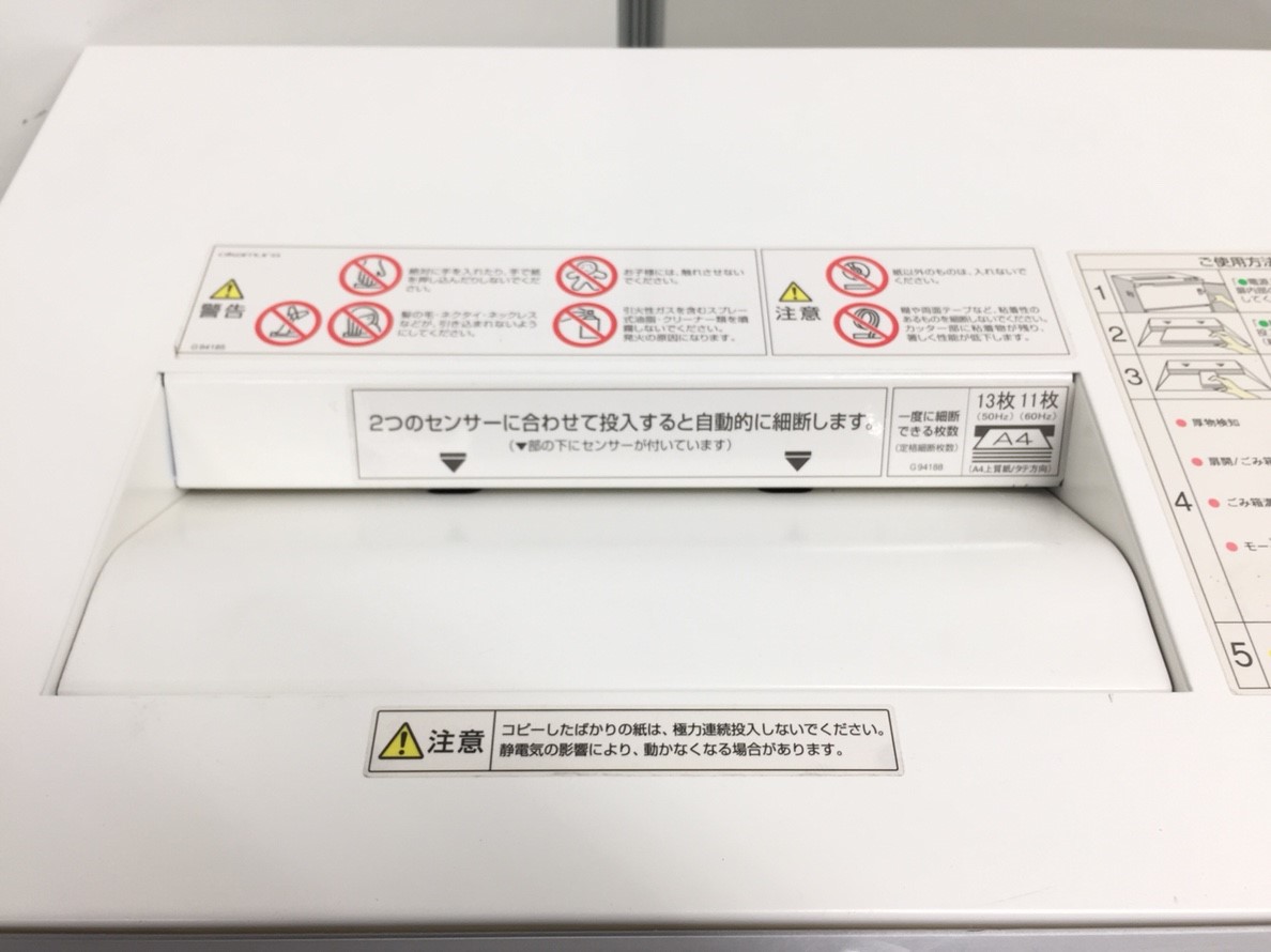 安全をコンセプトに作られたシュレッダーで、投入口が狭く作られており指が入ることのできない狭さになっています。また内部には間隔をあけてセンサーが搭載されていますのでネクタイなどの巻き込みも心配ありません!