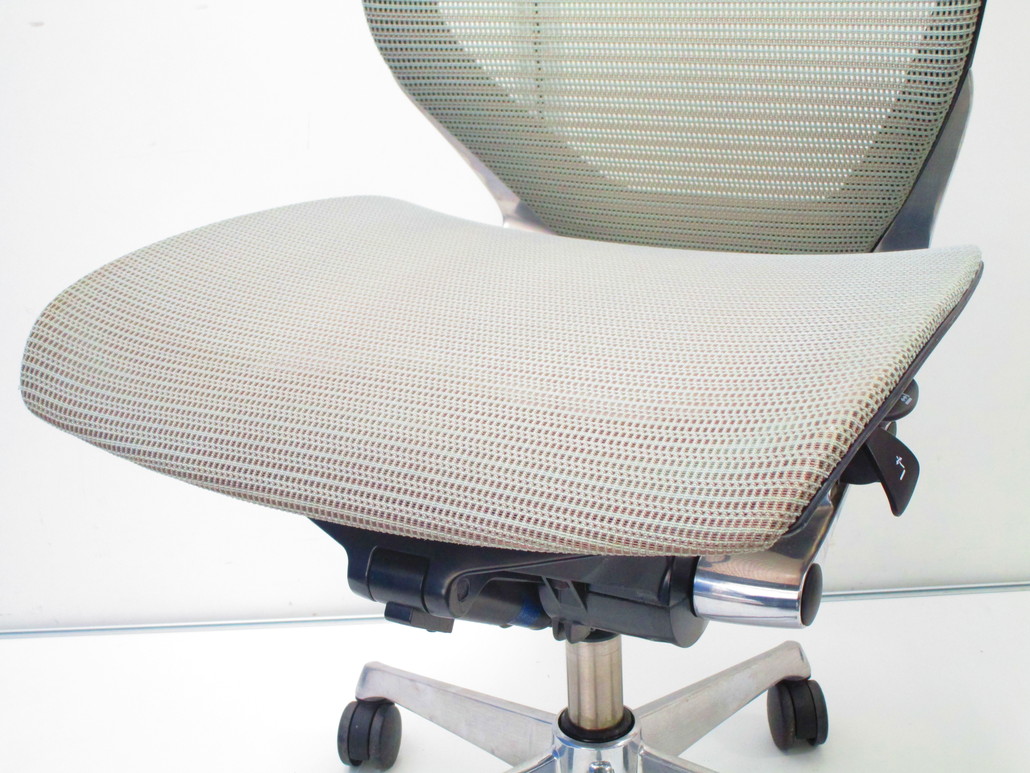 もちろん座り心地もコンテッサの直系ですから快適です。座面の素材はクッションとメッシュの2タイプあります。私、個人的には座面の中心部分でも外側でもテンションが変わらないクッション素材が、足を閉じても開いても快適なので推しです!"