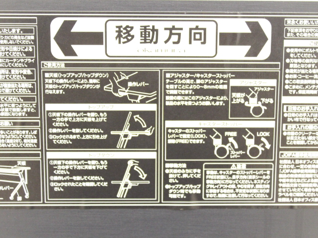 - 一部不具合あり天板歪み、アジャスター無し、キャスター使用不可ようなそのテーブルの本来の効用を果たすための機能以外の一部が使用不可な状態。(例、キャスターロッ ク機能使用不可、棚板無し等がある。)
