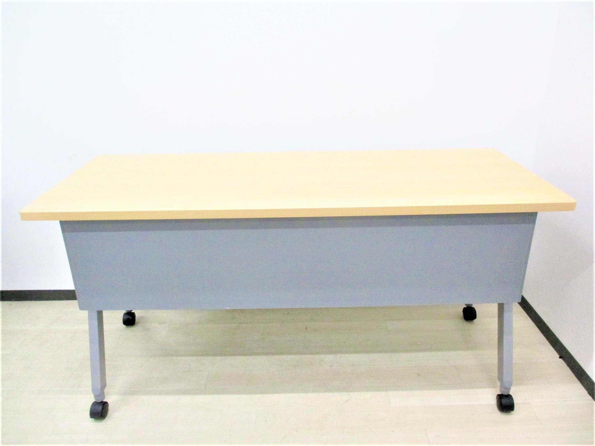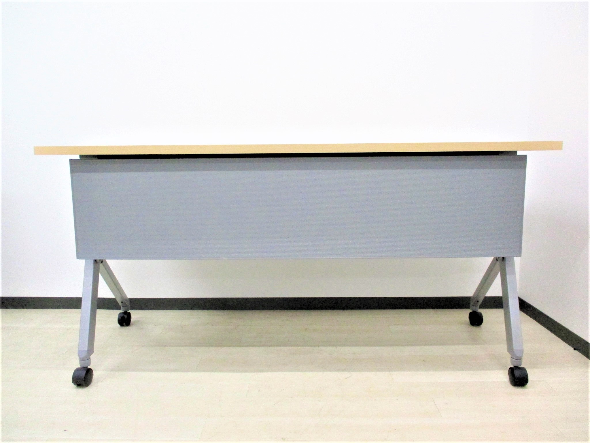 【天板跳ね上げ式でコンパクトに!キャスター付きで移動も楽々!】■オカムラ(okamura)製 フラプター(FLAPTOR)シリーズ サイドスタックテーブル 木目ナチュラル 幕板付き 《オフィスバスターズ福岡博多店は、福岡を拠点として、日本全国へ中古オフィス用品・オフィス家具を提供しております》