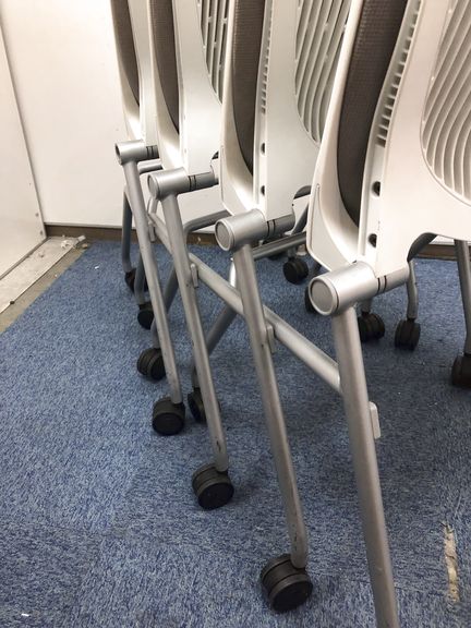 キャスター付き4本脚タイプは、座を跳ね上げることにより平行にネスティングが可能です。