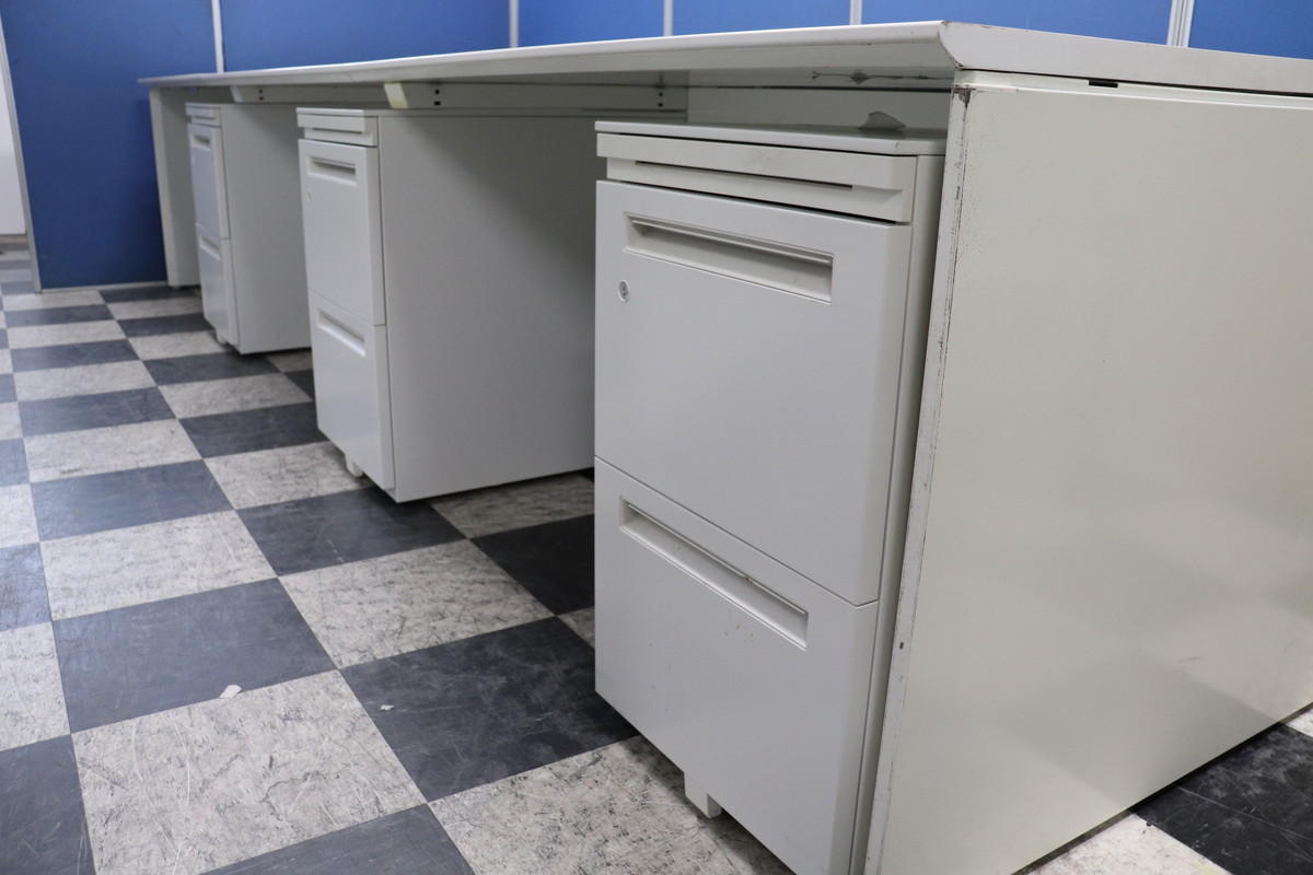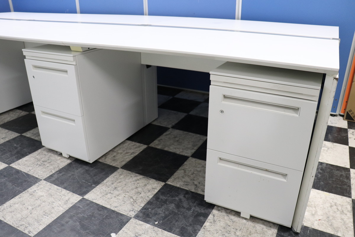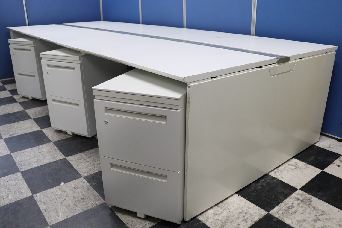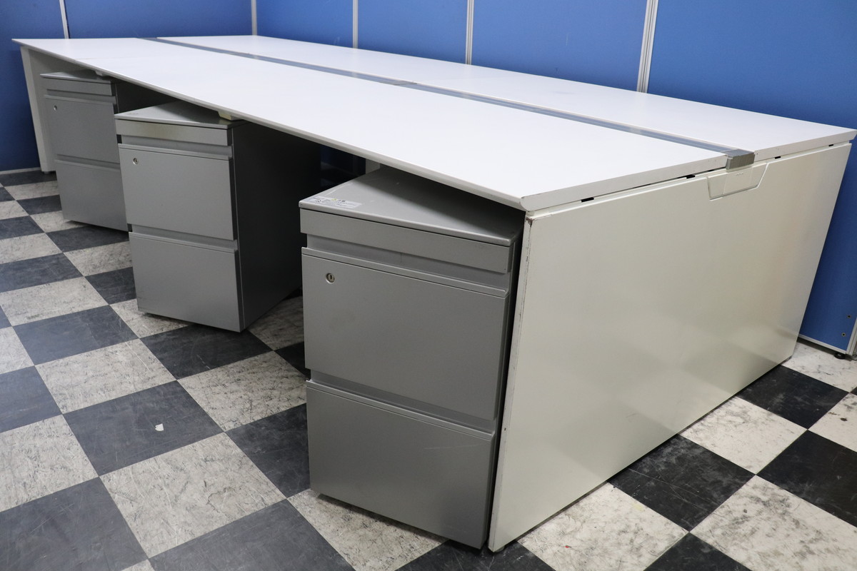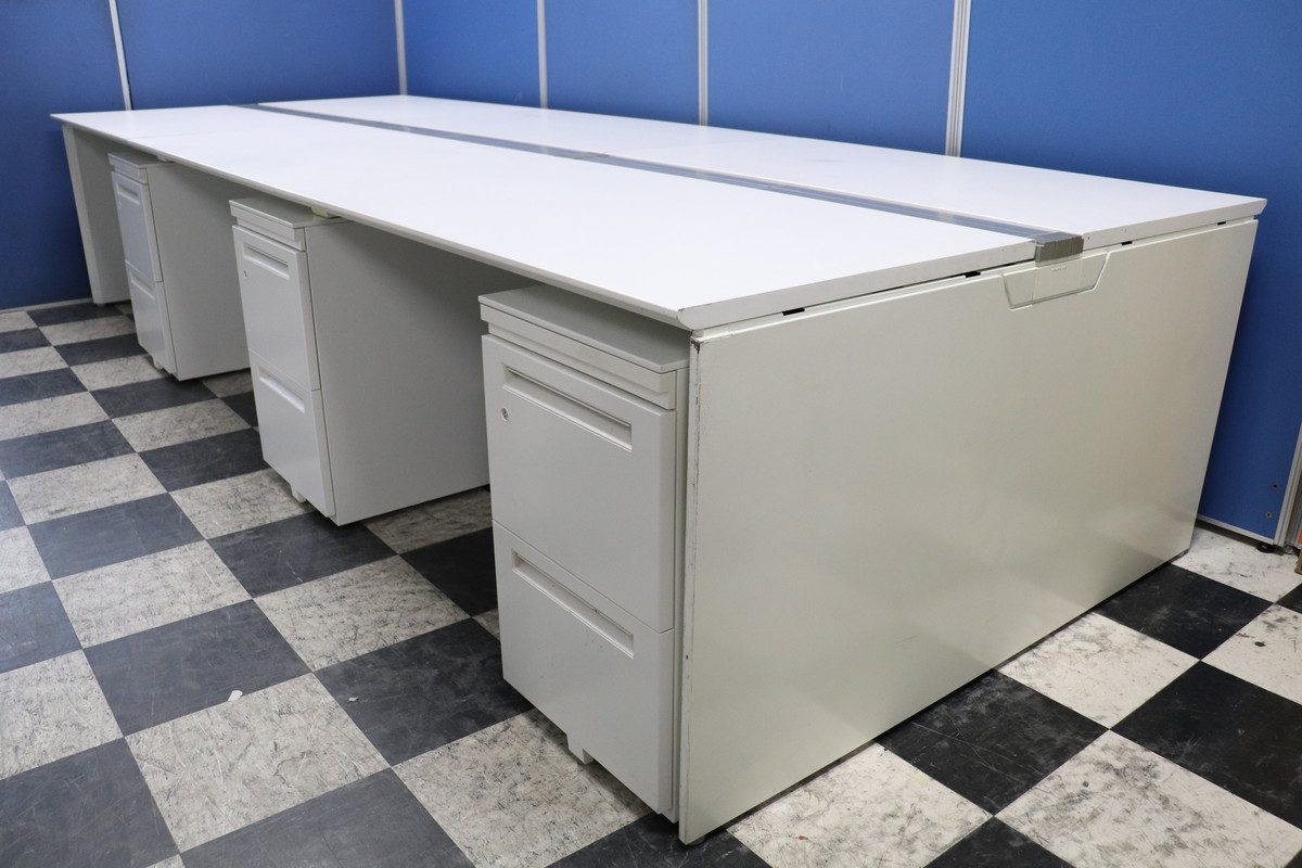 きれいなフリーアドレスデスク!収納も備えたワゴンとのセット!1人あたりの幅が取りやすい幅120cm天板!全体で360cm(4~6名様用)搬入も楽チンです!- 埼玉本店