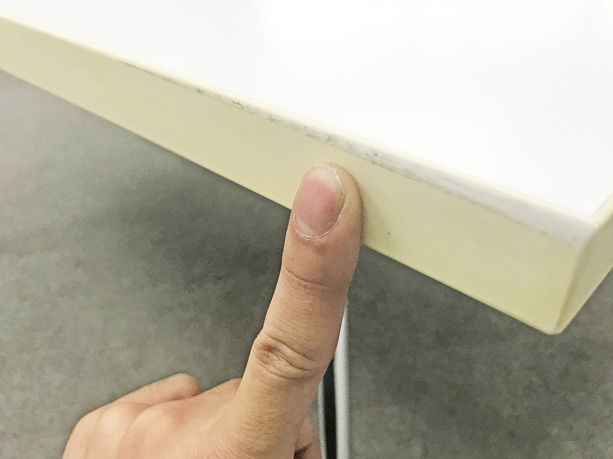 - あり黄ばみ・変色が広い範囲にうっすらある、または濃い黄ばみ・変色が一部ある。(例、天板、幕板、棚板、サイド部分、脚部等にある。)