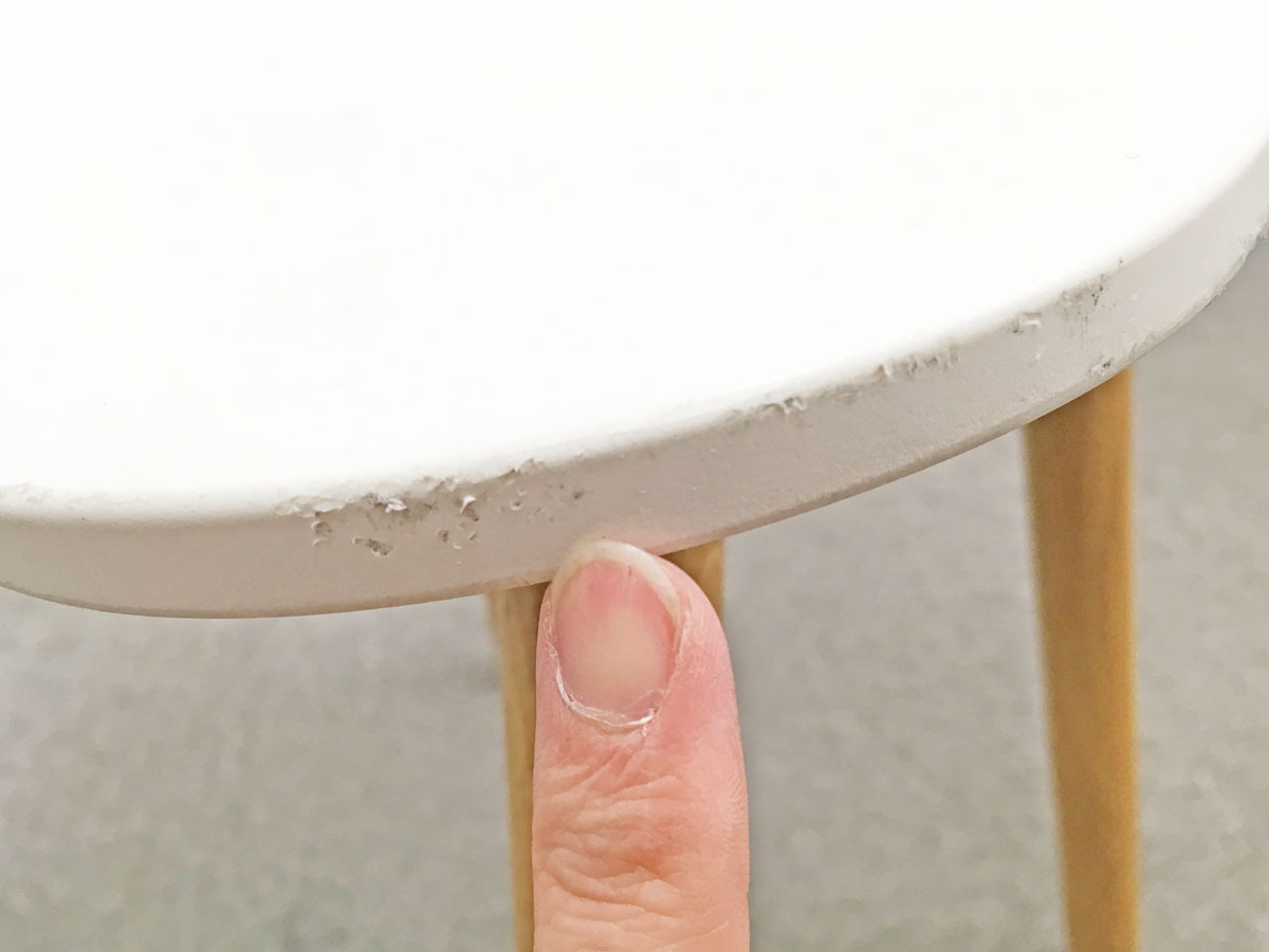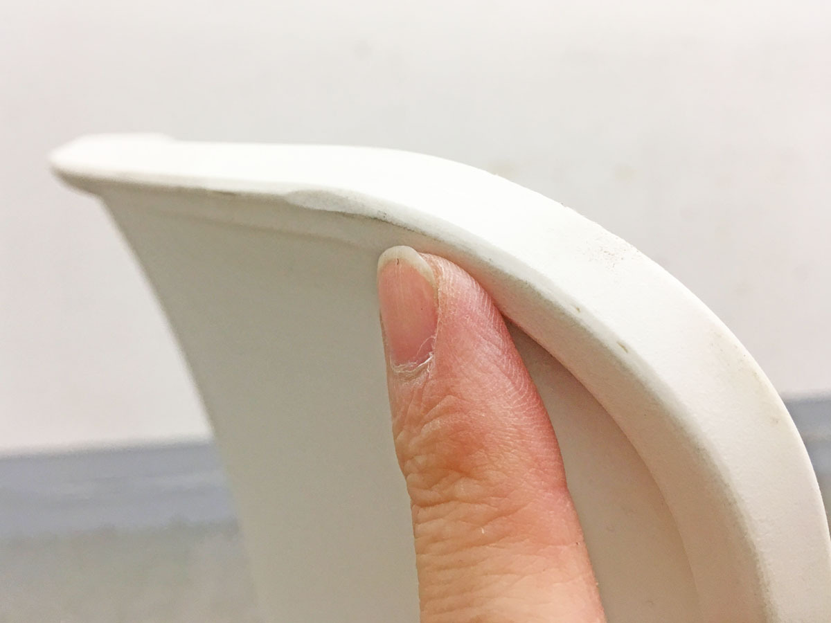 - かなり強い濃い黄ばみ・変色が商品全体にある。(例、座面・背もたれ、脚部等にある。)