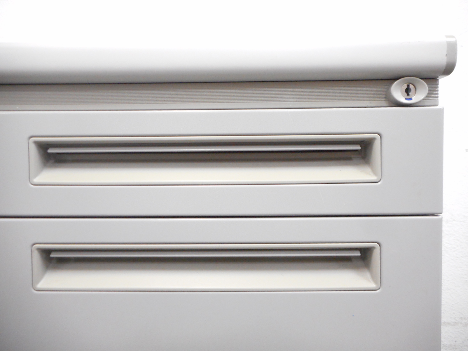 - シンプルながらも使いやすい工夫があります。ロックは、一度の施錠ですべての引出しの鍵がかかるオールロック機構。