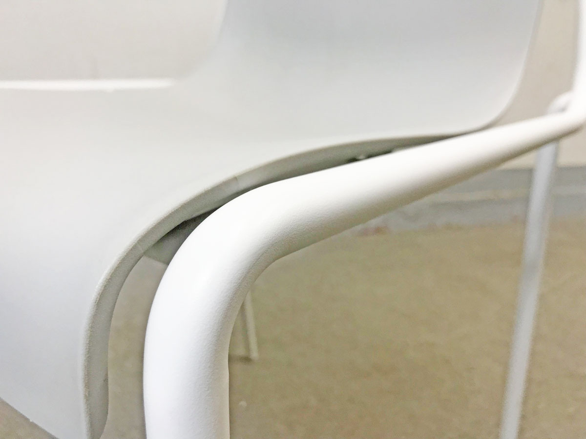 このフレームによって椅子が引きやすく、スムーズな持ち運びやスタッキングが可能になっています