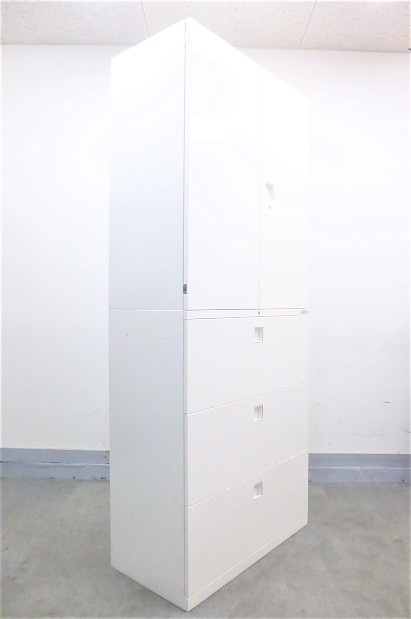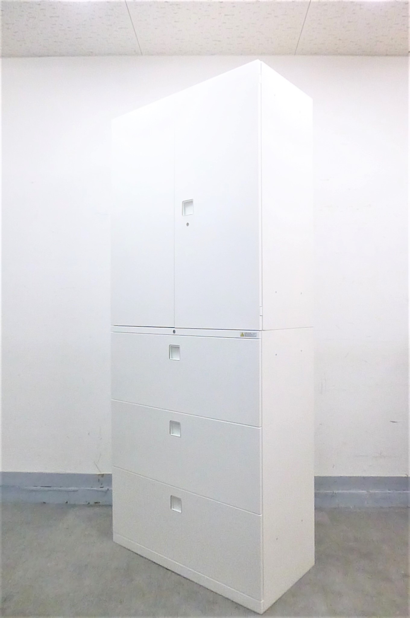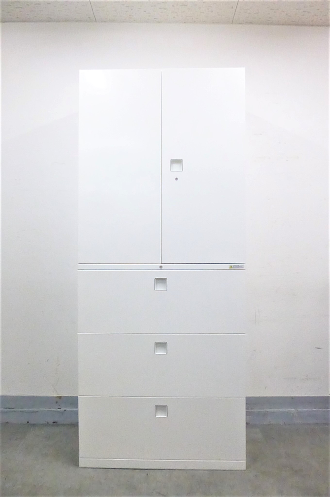 スライド式の扉+引き出しタイプの便利な書庫セットが入荷!使い勝手抜群のハイキャビネットが入荷! ■オカムラ/レクトライン/ホワイト 2枚引き戸+3段ラテラルキャビネット
