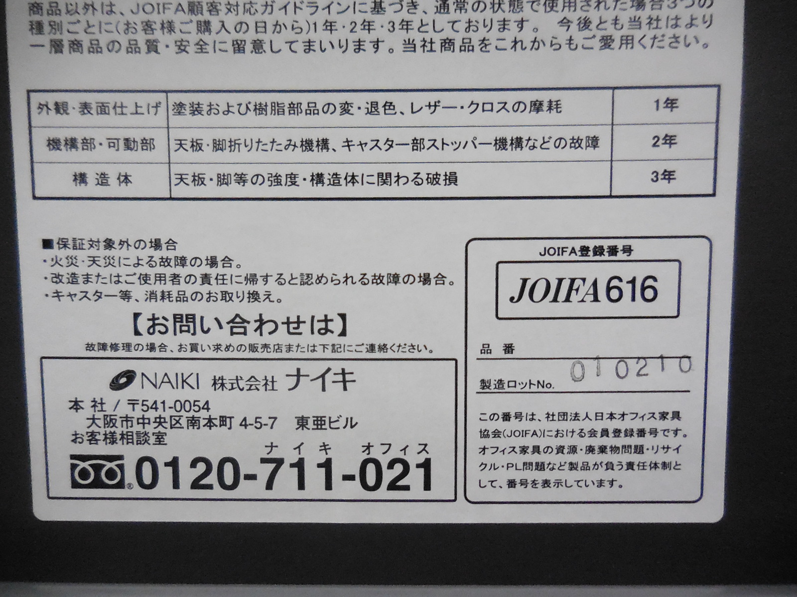 - 一部不具合あり天板歪み、アジャスター無し、キャスター使用不可ようなそのテーブルの本来の効用を果たすための機能以外の一部が使用不可な状態。(例、キャスターロッ ク機能使用不可、棚板無し等がある。)