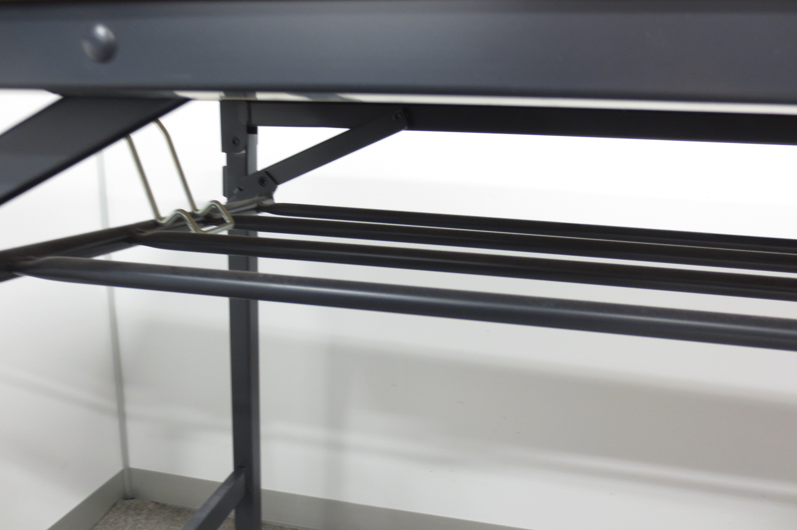 - 一部不具合あり天板歪み、アジャスター無し、キャスター使用不可ようなそのテーブルの本来の効用を果たすための機能以外の一部が使用不可な状態。(例、キャスターロッ ク機能使用不可、棚板無し等がある。)