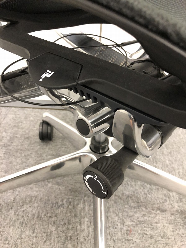 - ロッキングの強弱を調整するダイヤルがございます。体型に合わせてリクライニングの固さを座ったままで調整できます。
