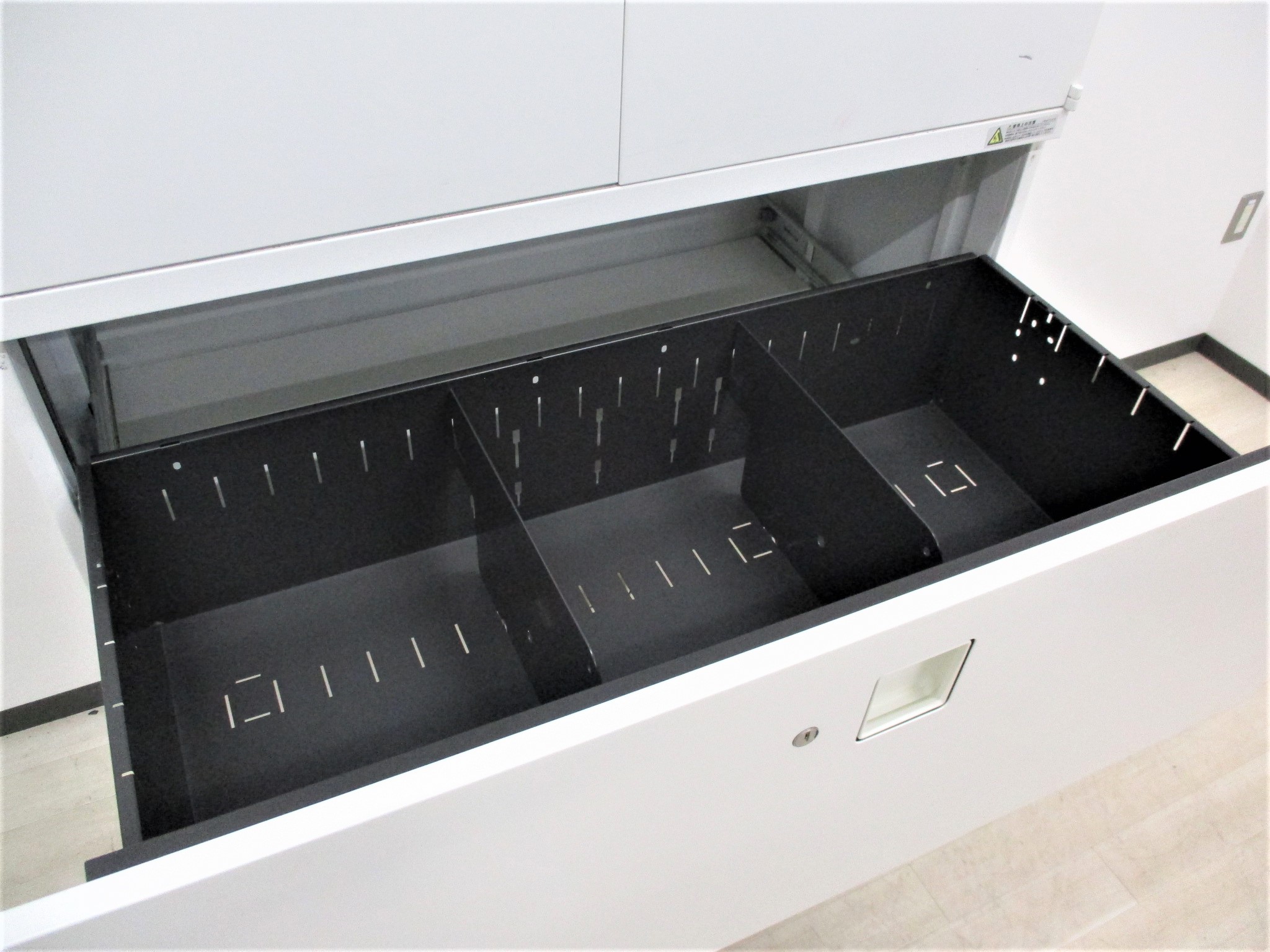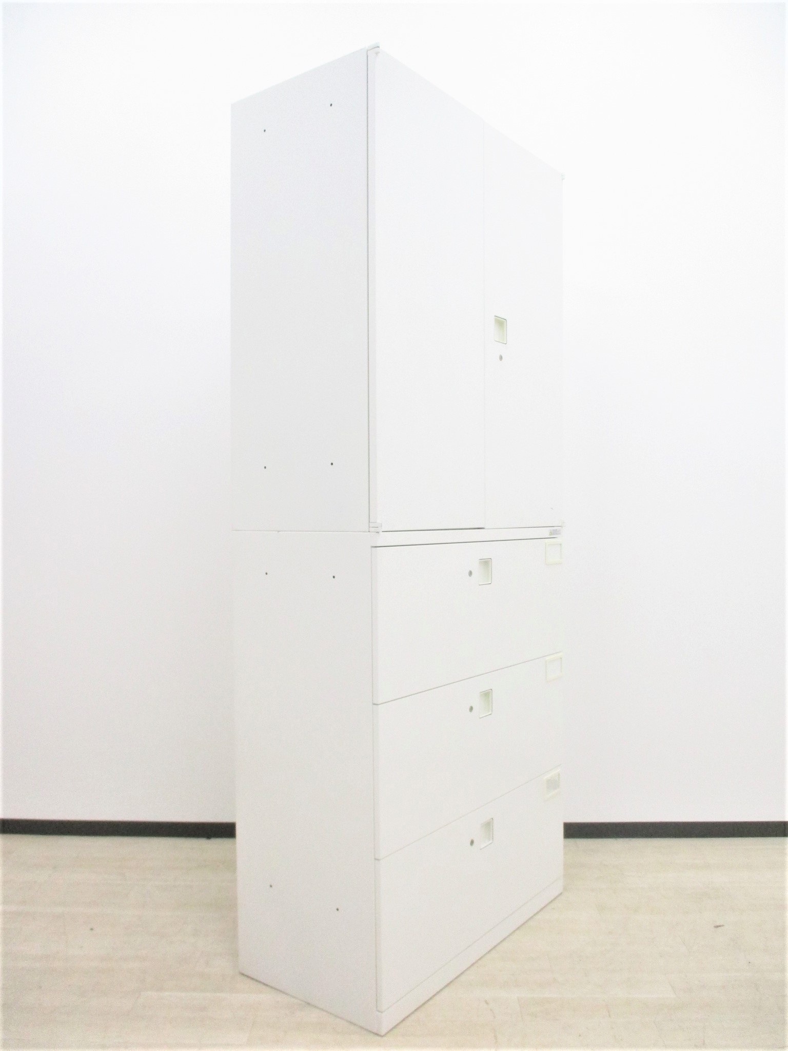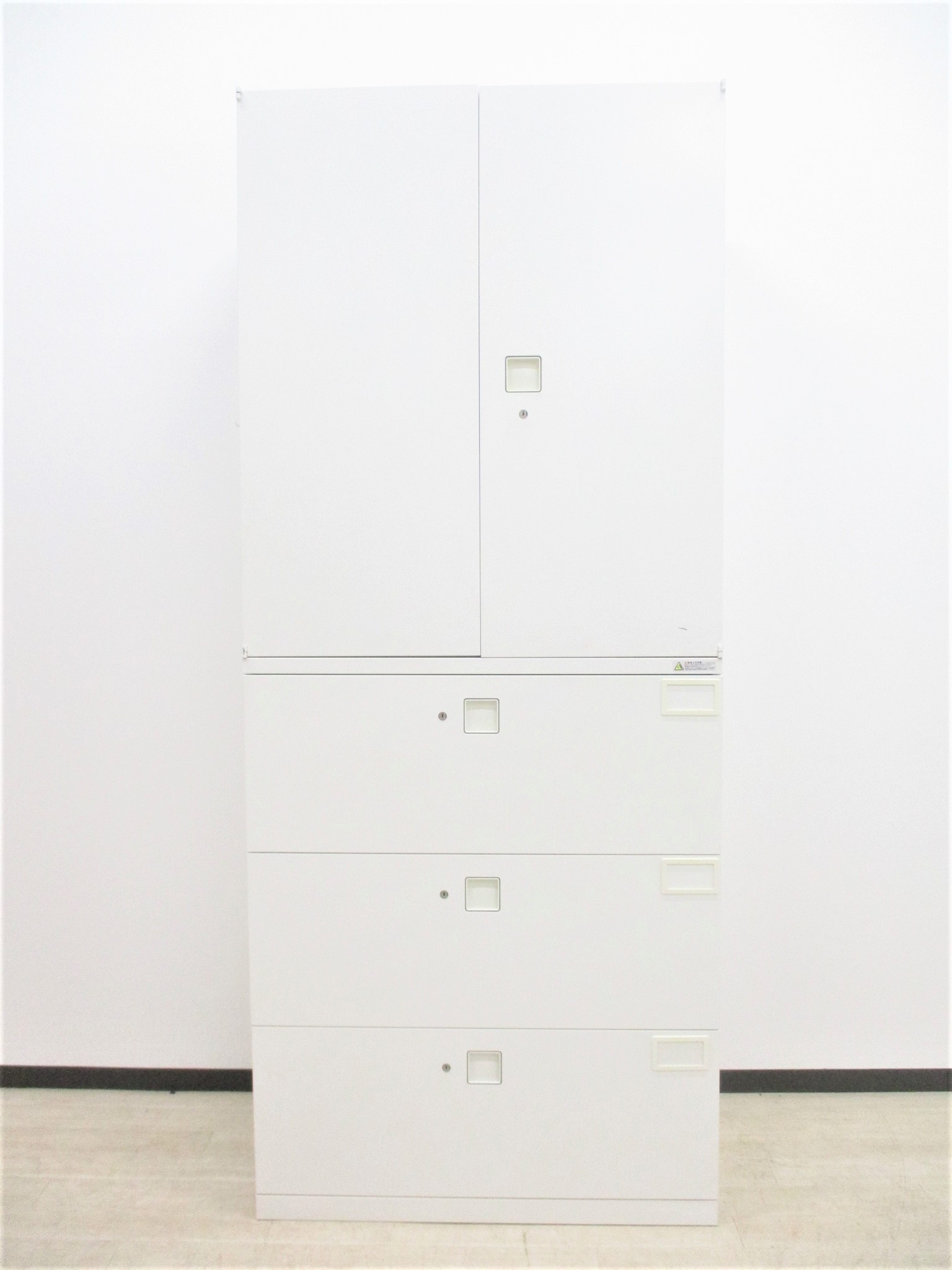 スライド式の扉+引き出しタイプの便利な書庫セットが入荷!使い勝手抜群のハイキャビネットが入荷! ■オカムラ/レクトライン/ホワイト 2枚引き戸+3段ラテラルキャビネット
