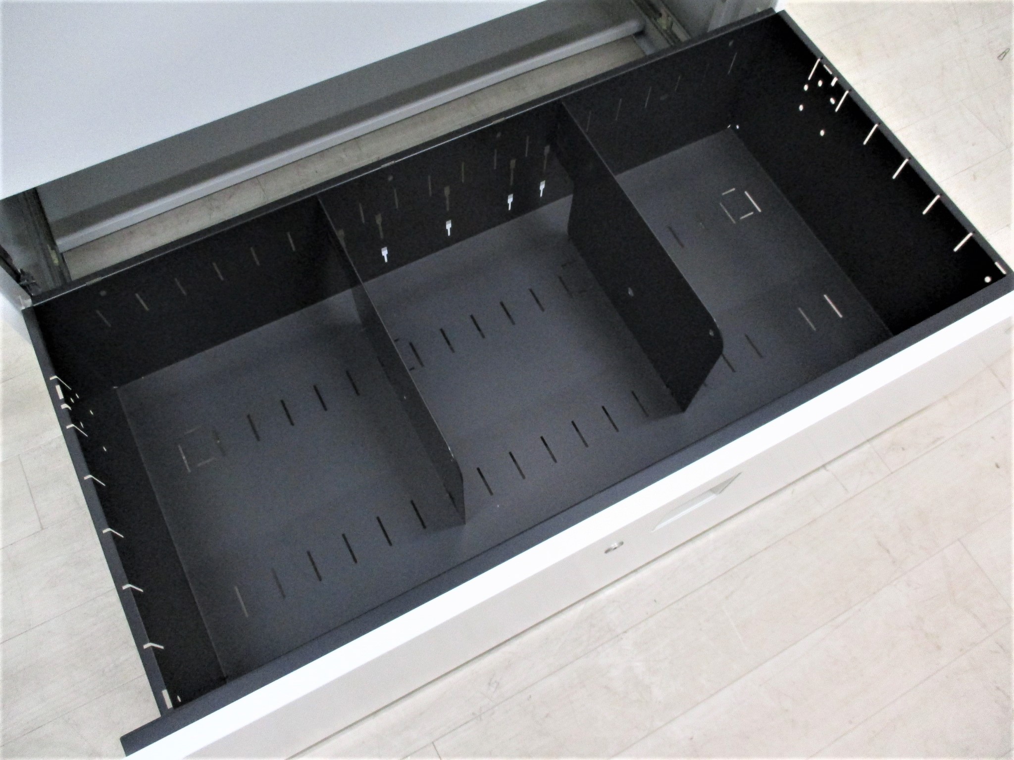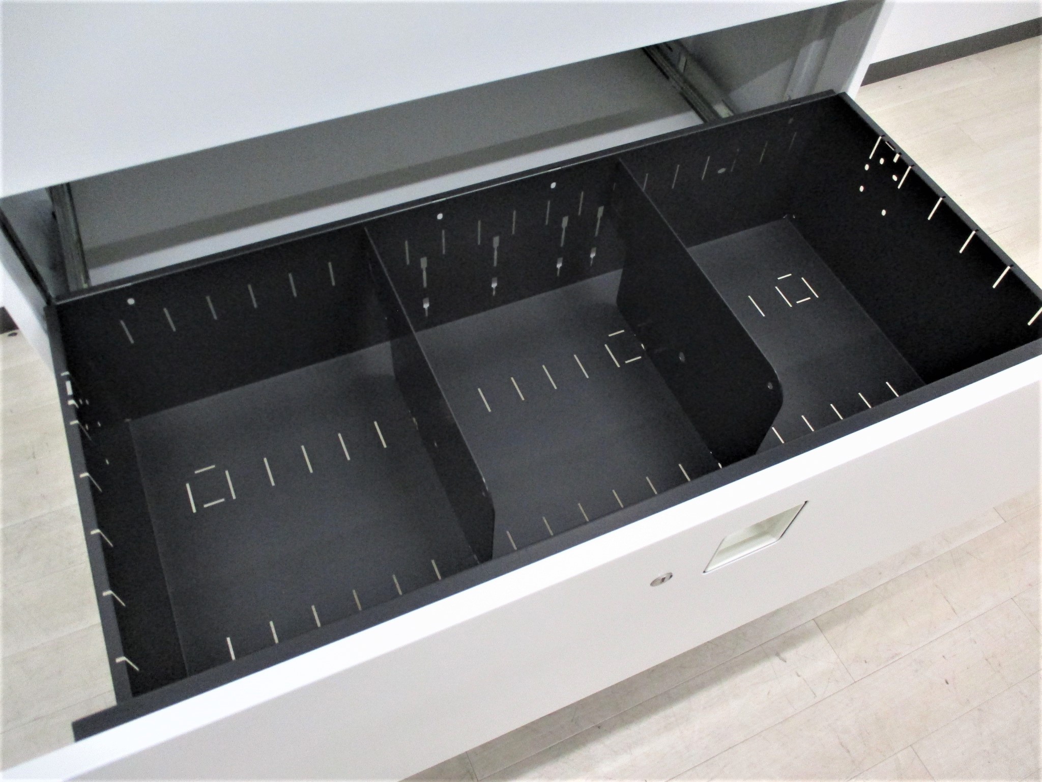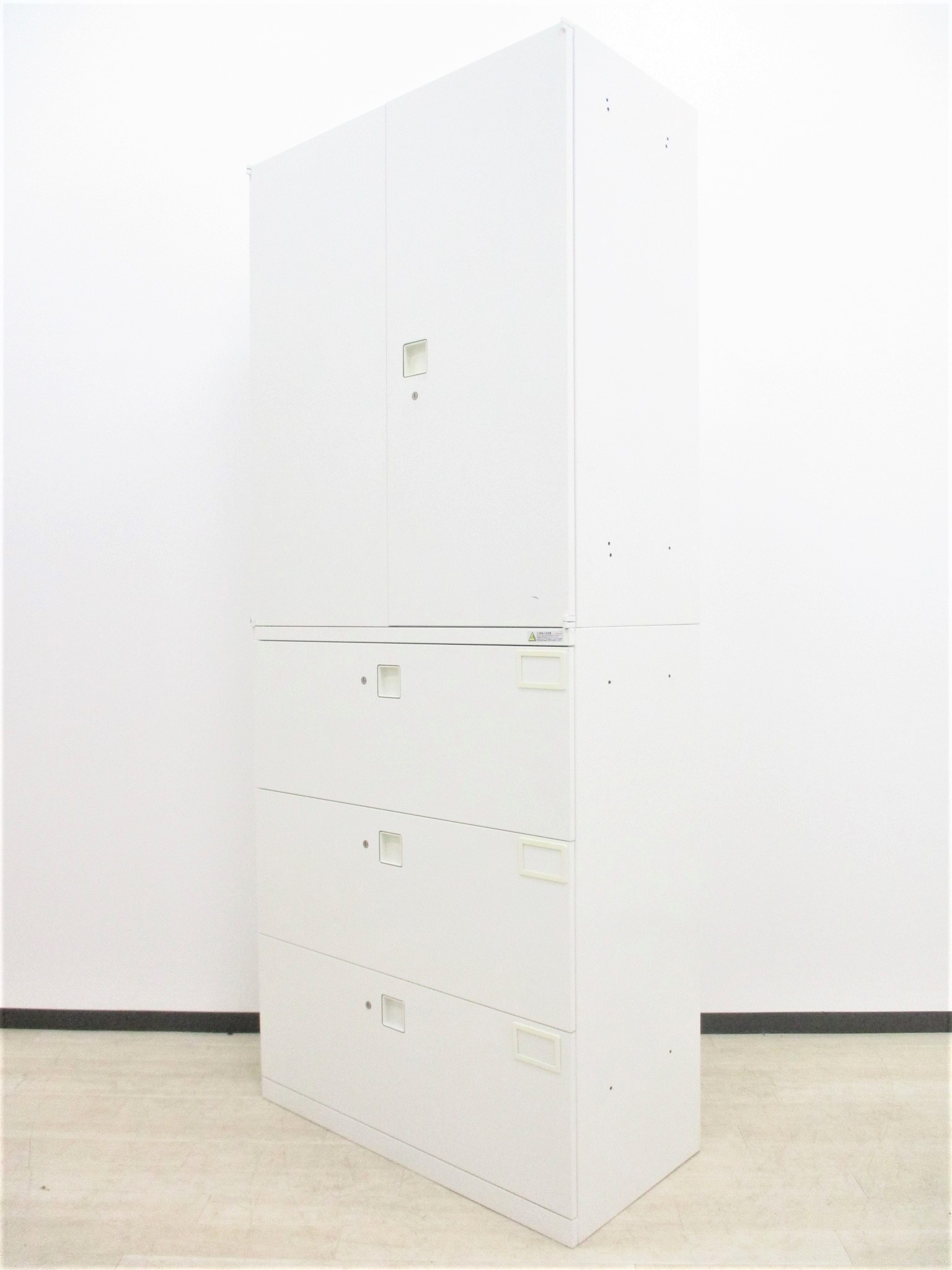 スライド式の扉+引き出しタイプの便利な書庫セットが入荷!使い勝手抜群のハイキャビネットが入荷! ■オカムラ/レクトライン/ホワイト 2枚引き戸+3段ラテラルキャビネット