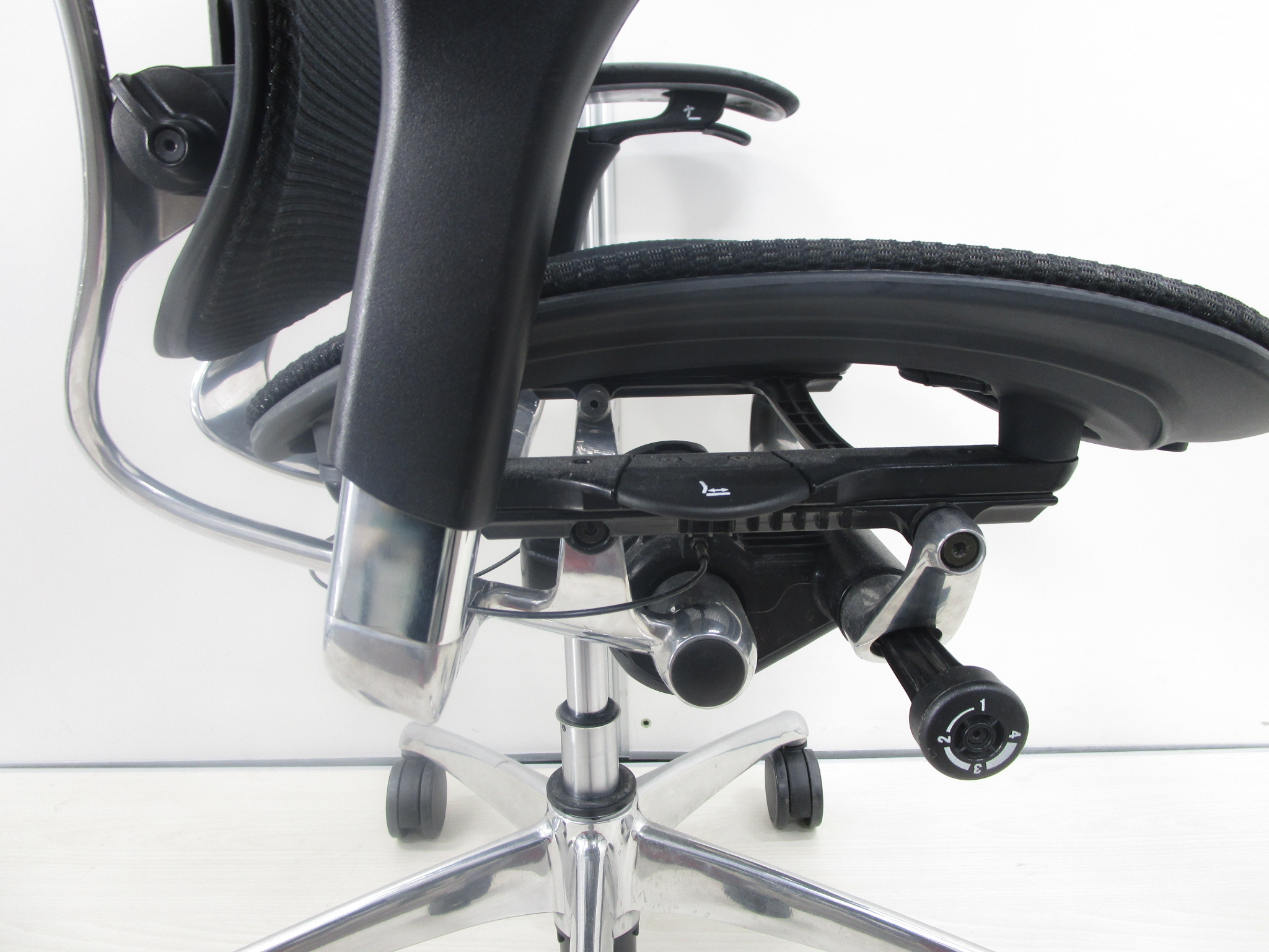 - 座面の前後スライド調整レバーで操作(前後50mm分調整で)できます。(グラデーションサポートメッシュタイプを除く)