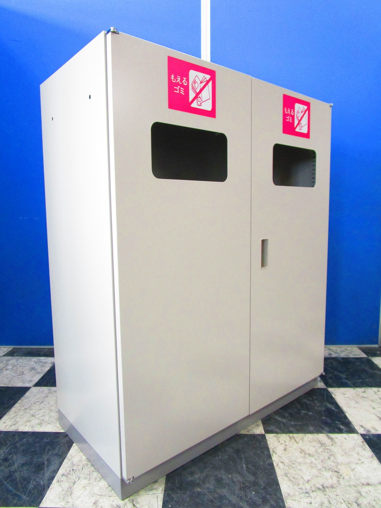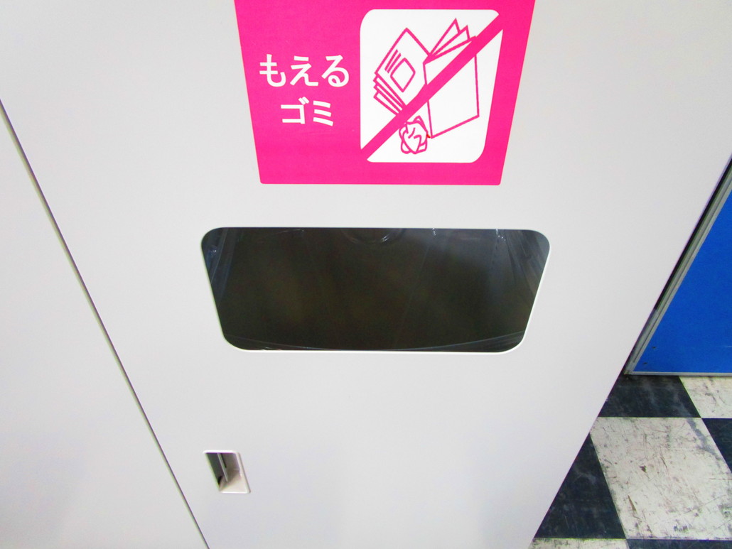 正面の扉には、2つの大きな穴。燃えるごみと不燃ごみ。または空き缶とペットボトルなど、分類して投入が可能です。