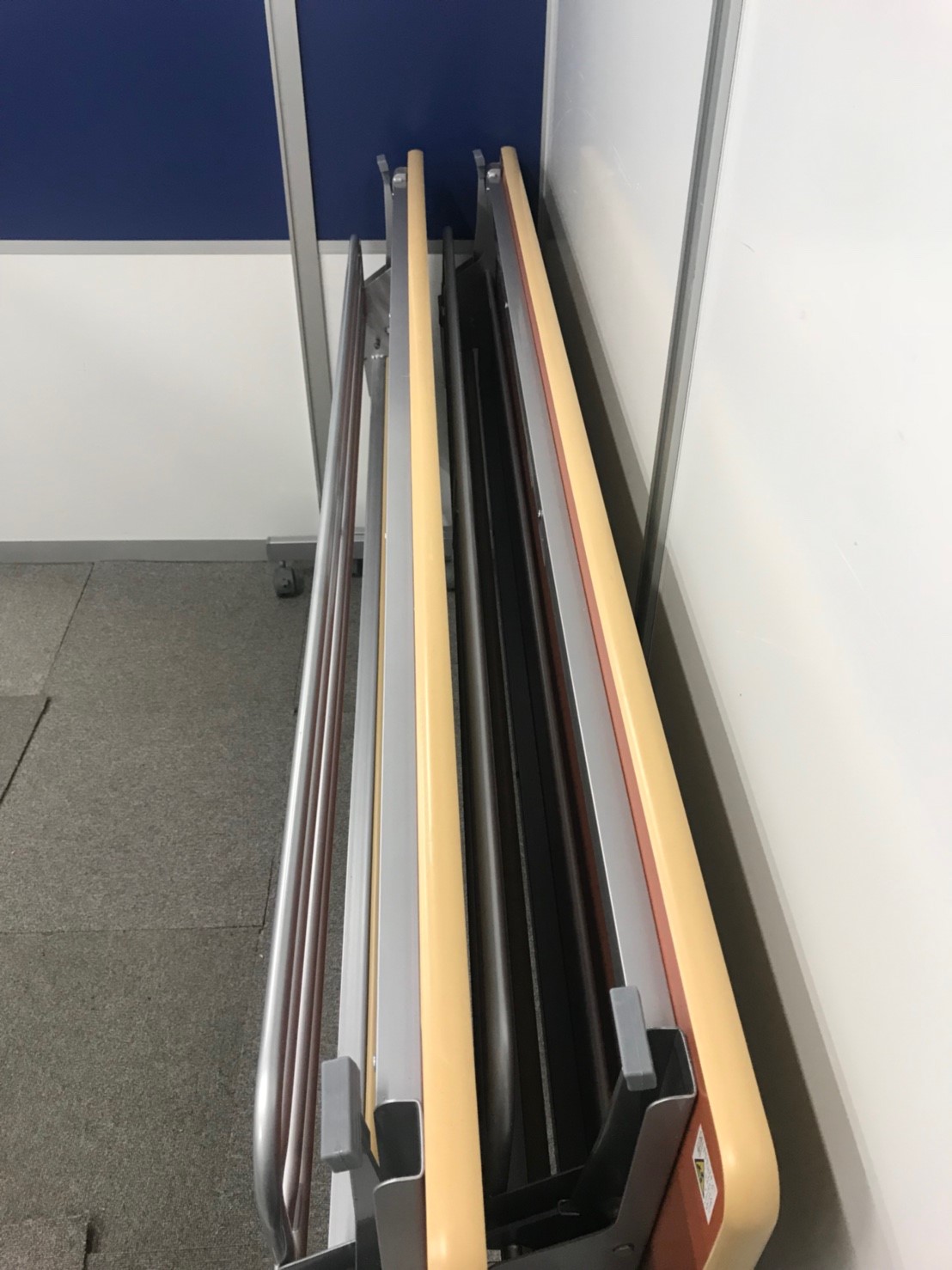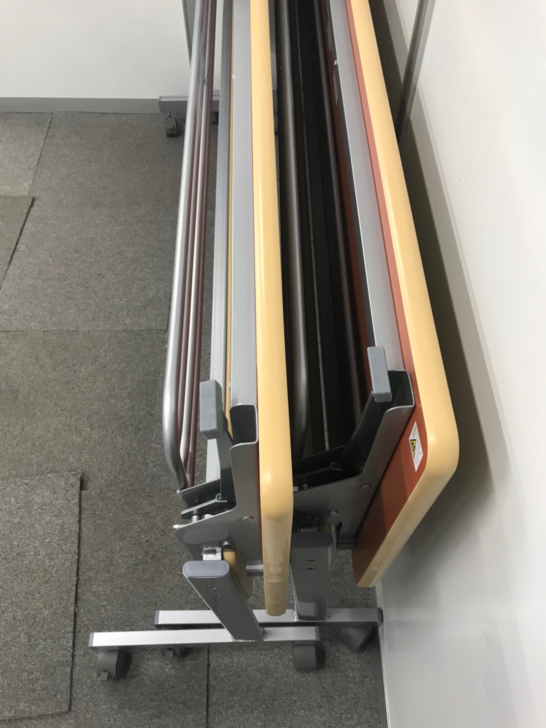 - 一部不具合あり天板歪み、アジャスター無し、キャスター使用不可ようなそのテーブルの本来の効用を果たすための機能以外の一部が使用不可な状態。(例、キャスターロッ ク機能使用不可、棚板無し等がある。)